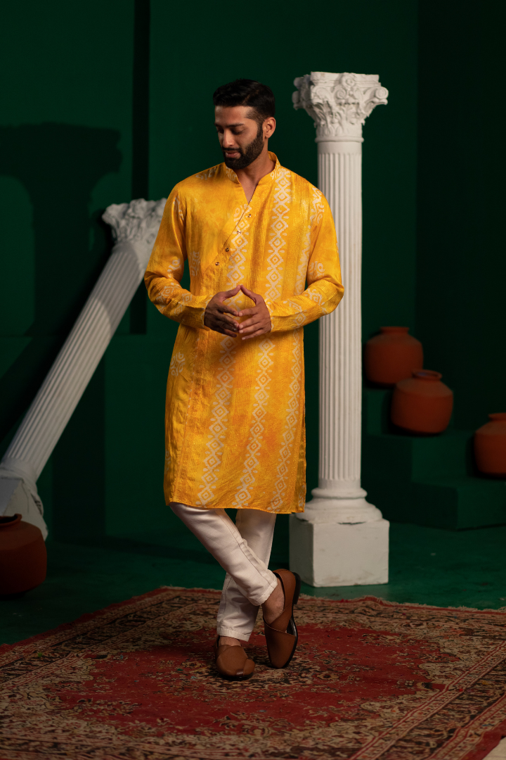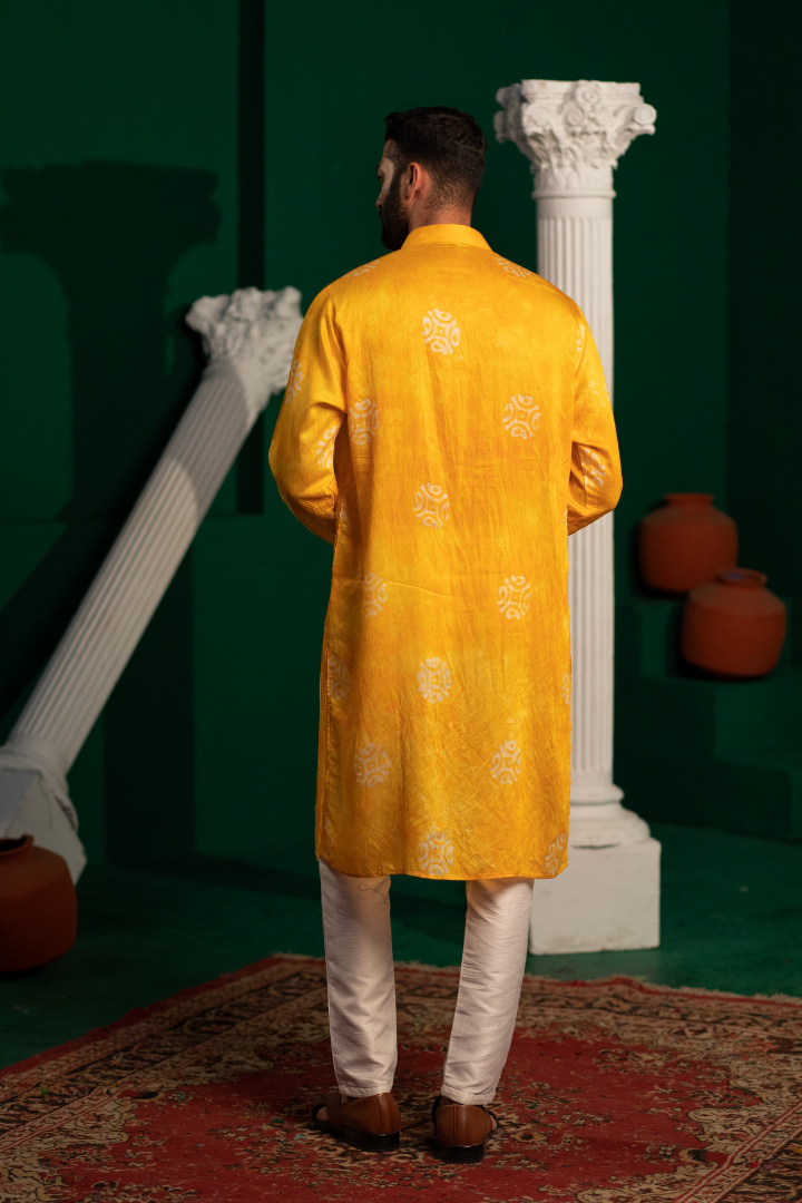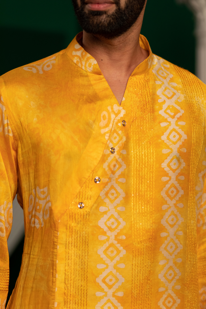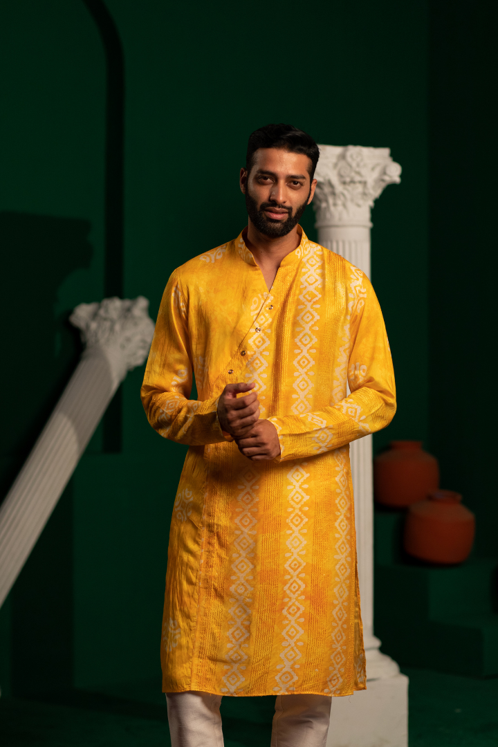 A heritage-inspired kurta featuring traditional batik prints on Chanderi silk. The mellow yellow shade enhances the artisanal patterns.