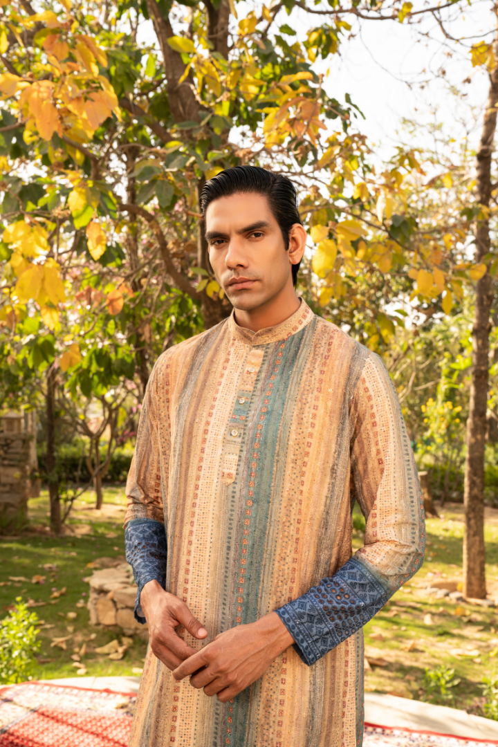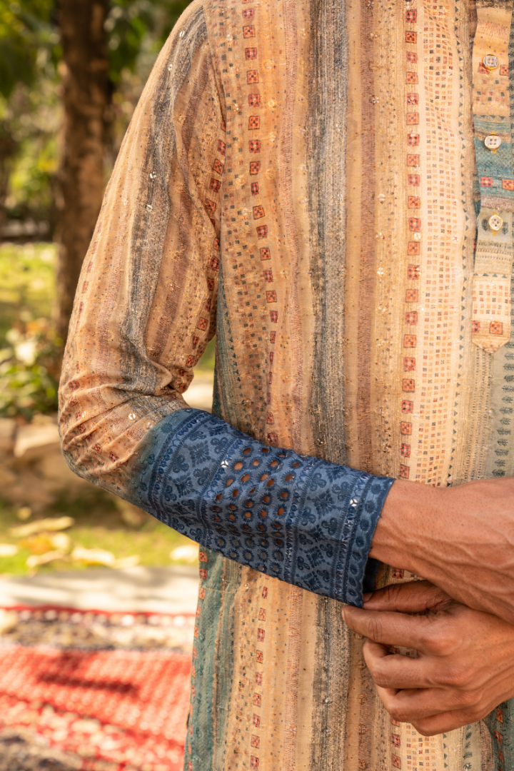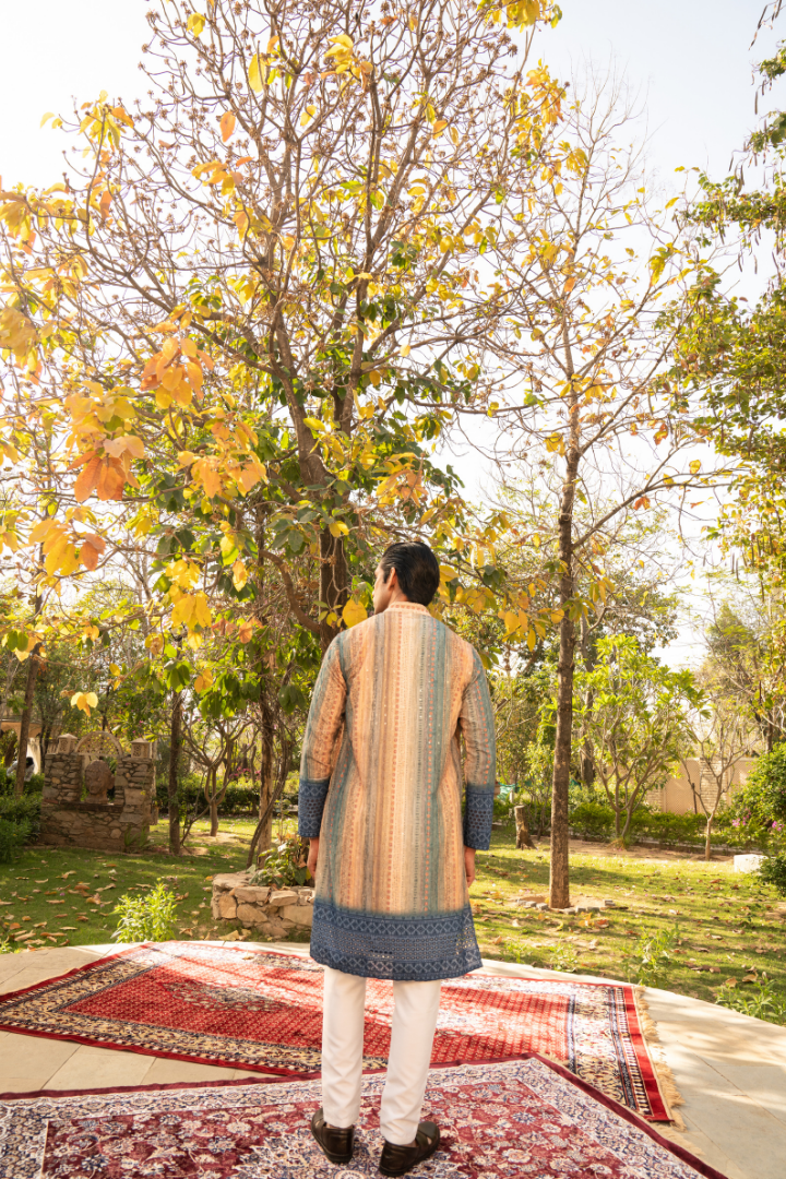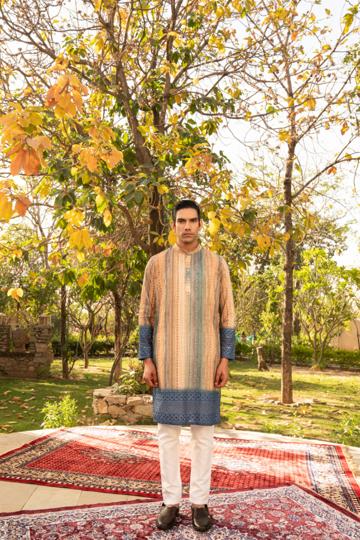 This captivating kurta features a mesmerizing color palette reminiscent of a starry night sky. The gradient effect transitions from deep blues to purples and hints of starry white, creating a truly otherworldly appearance.