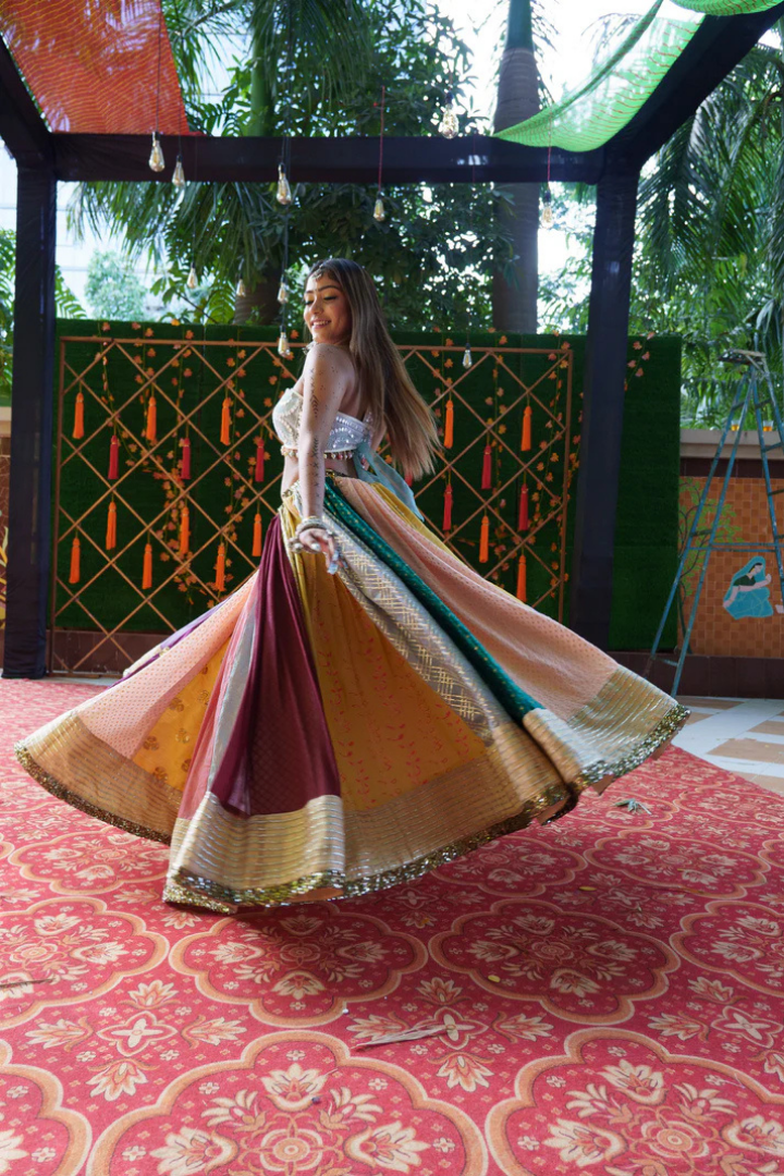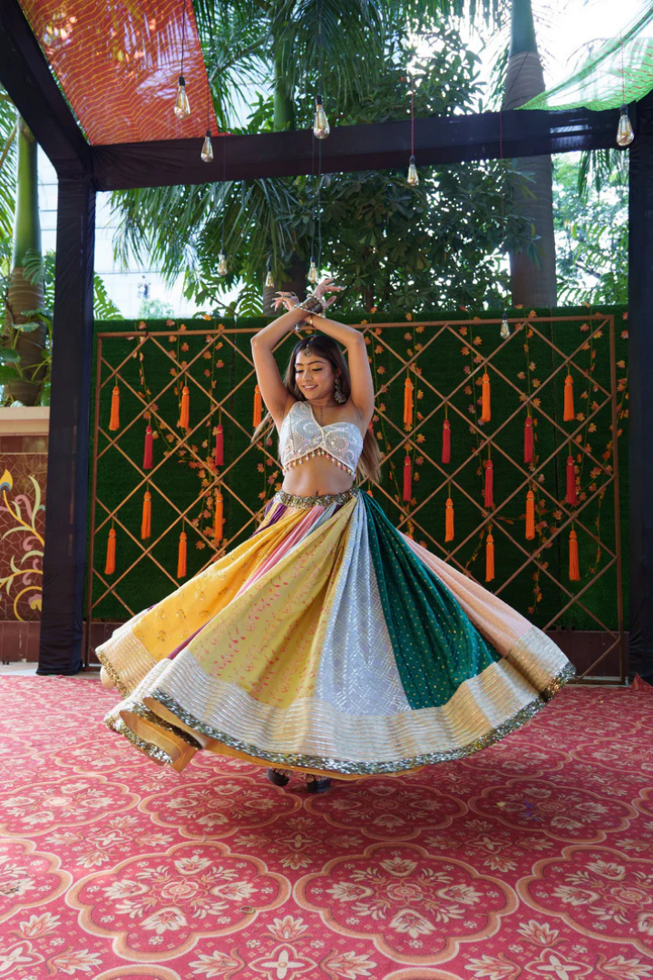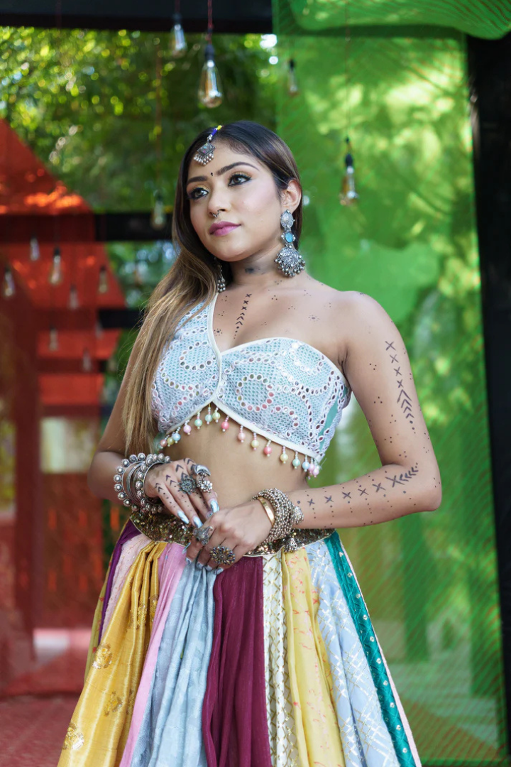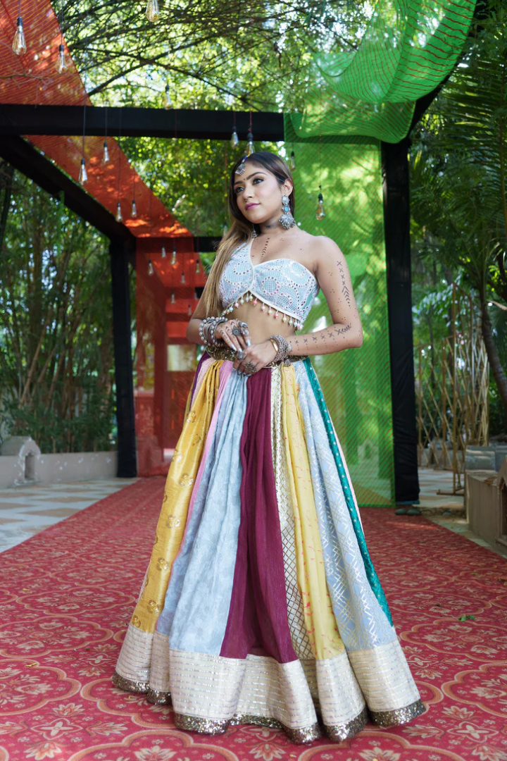 Multi-Colored Raw Silk Lehenga with Intricate Mirror Blouse