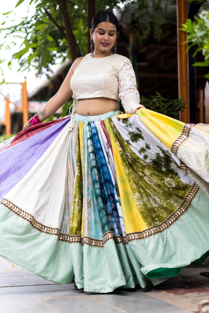 Elevate your style with our exquisite Multicolor Lehenga set. Crafted from luxurious silk, this ensemble boasts a stunning blend of vibrant hues, making it a true showstopper. The lehenga features a graceful Pista Green border, adding a touch of elegance to its already captivating design. The accompanying blouse is a masterpiece in itself, adorned with intricate golden sequin work, adding a shimmering allure to your look. Complete the ensemble with a matching dupatta, and you're ready to make a statement at any special occasion. Embrace timeless elegance with this Multicolor Lehenga set, perfect for those who appreciate artistry and sophistication.