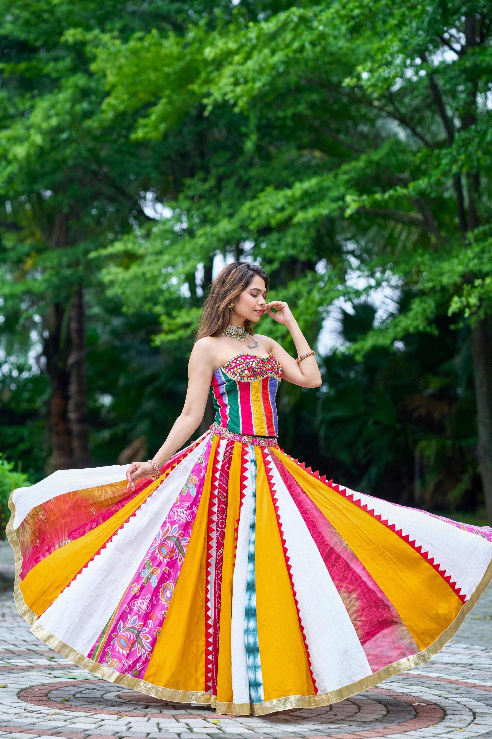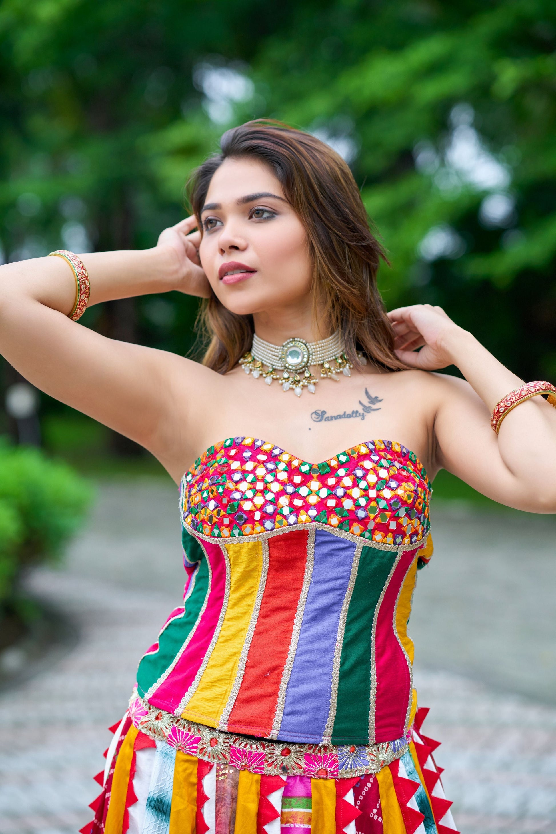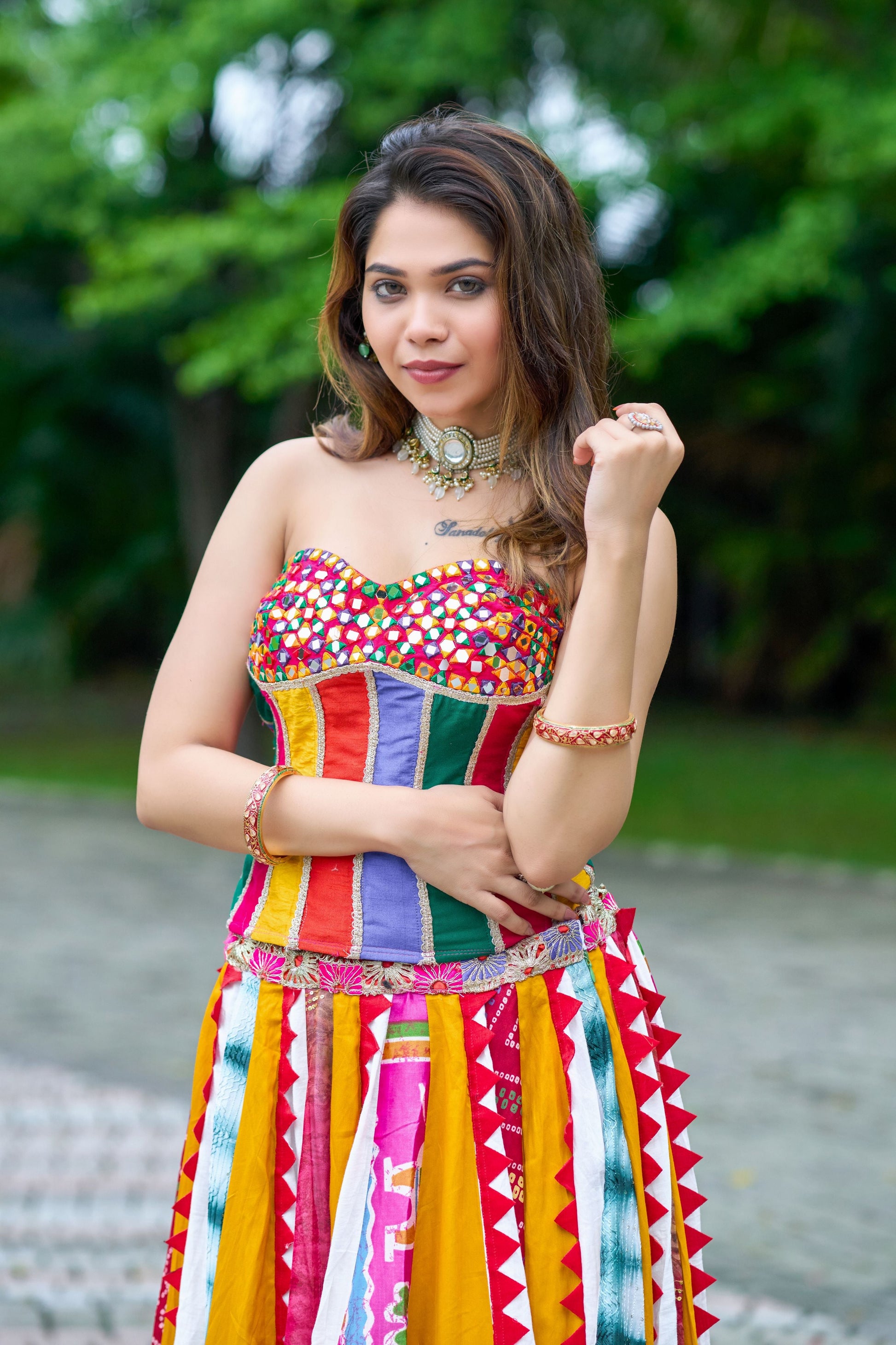 Old Marigold Corset with Multi Lehenga has a fitted corset top and a flared lehenga skirt. The skirt moves easily as you walk. The fabric is light and comfortable for long hours. The marigold color blends with multicolor layers, giving it a bright look without extra weight. This set works well for weddings, festivals, or family functions.