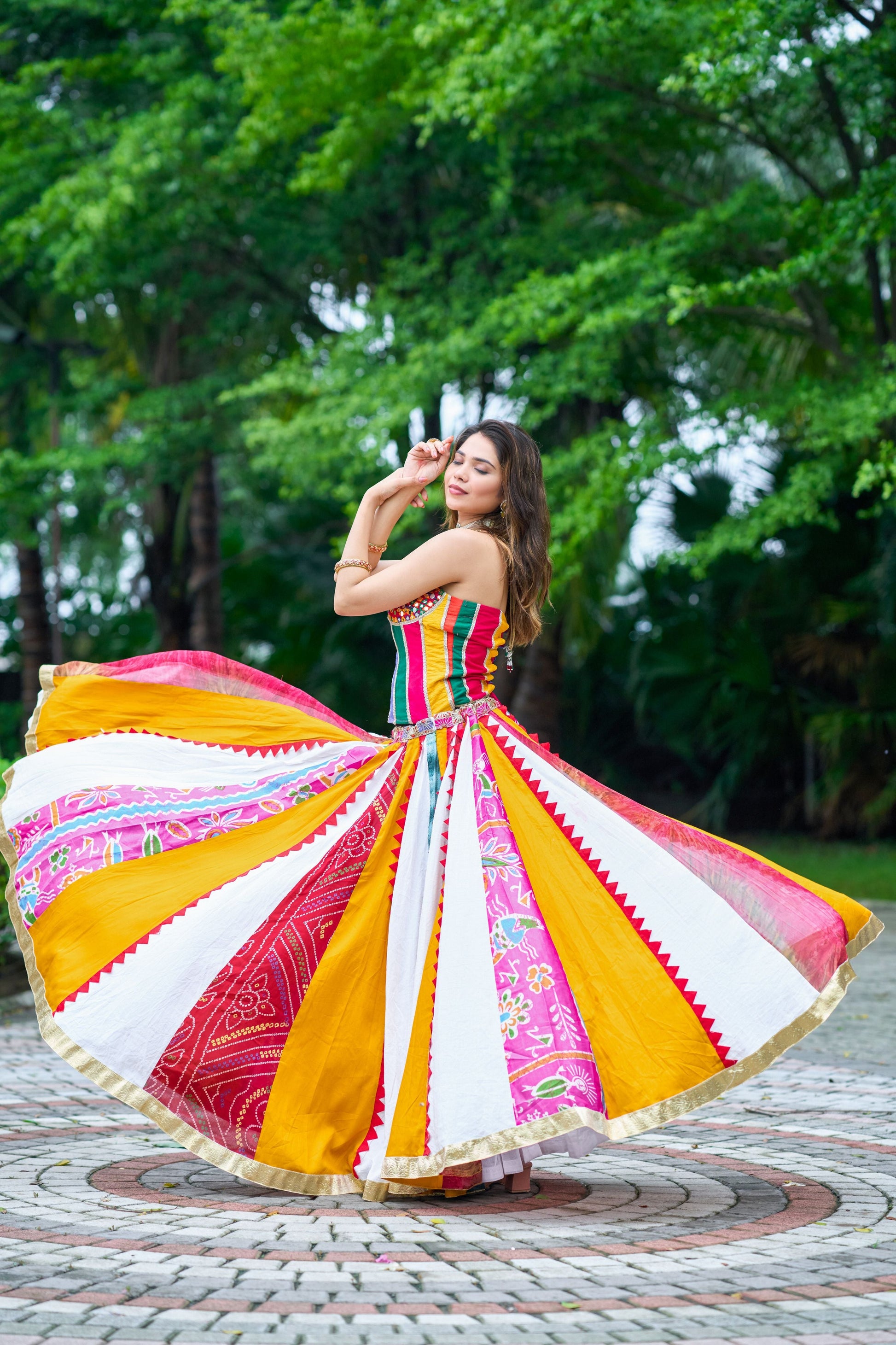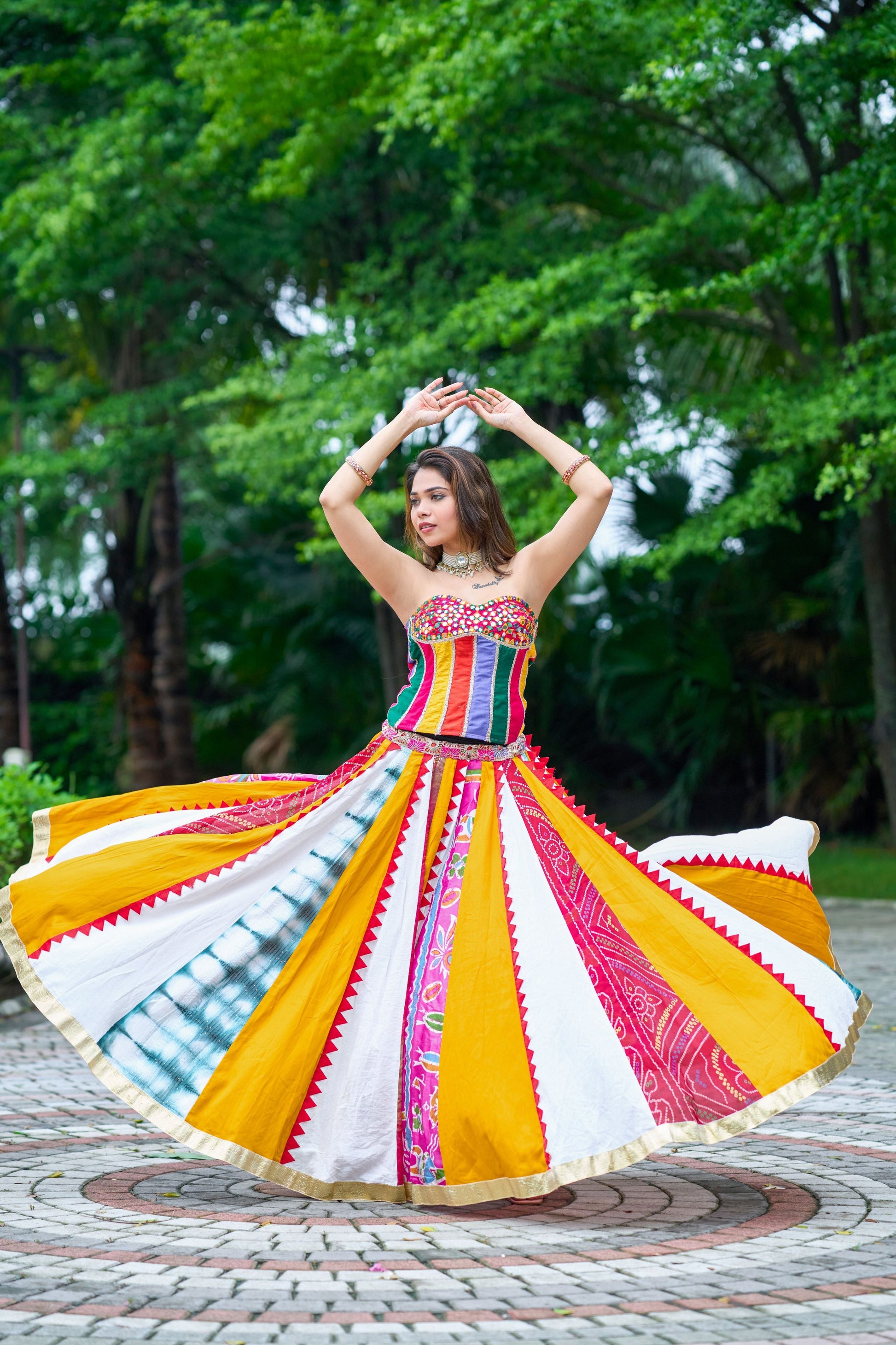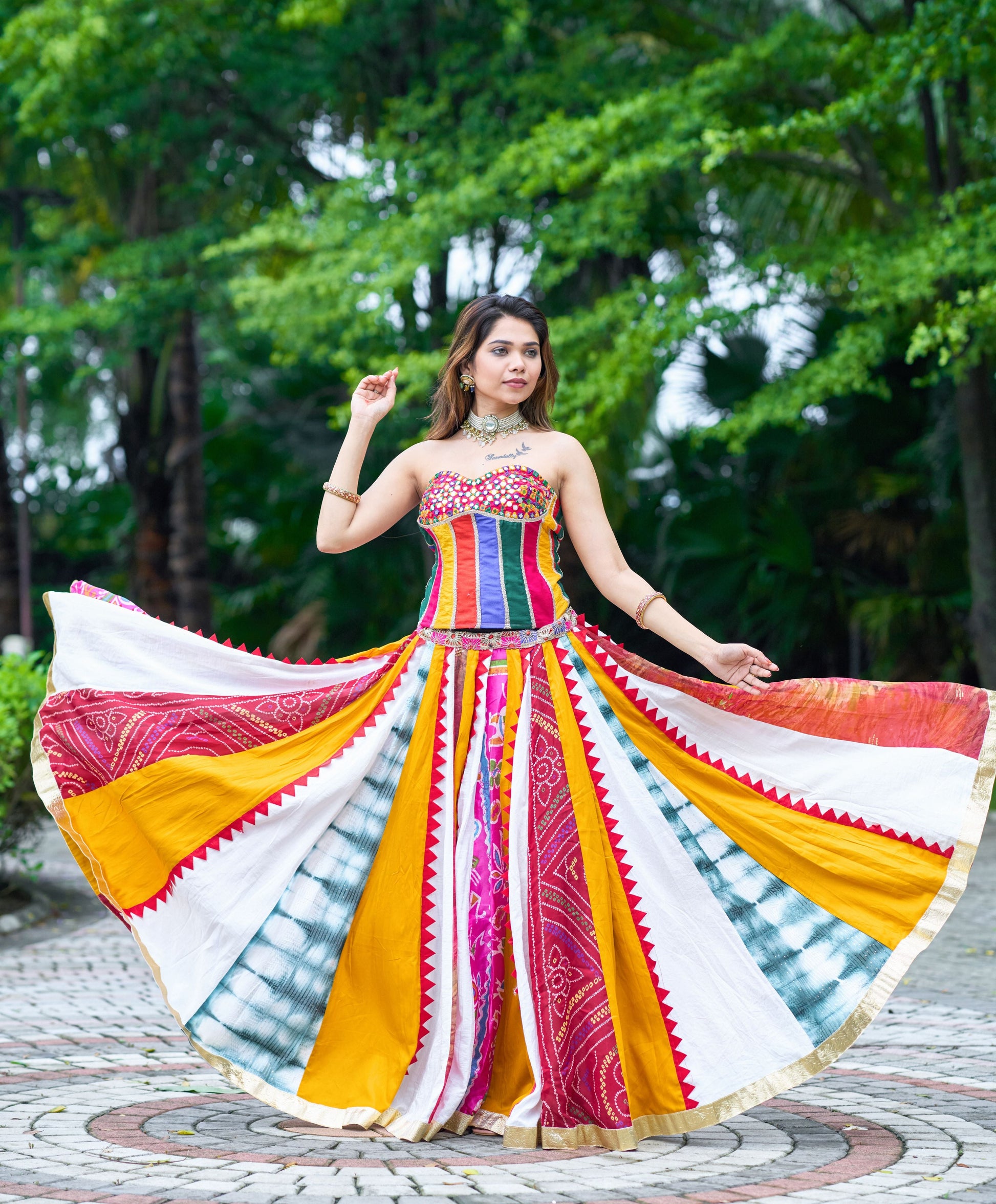 Old Marigold Corset with Multi Lehenga has a fitted corset top and a flared lehenga skirt. The skirt moves easily as you walk. The fabric is light and comfortable for long hours. The marigold color blends with multicolor layers, giving it a bright look without extra weight. This set works well for weddings, festivals, or family functions.
