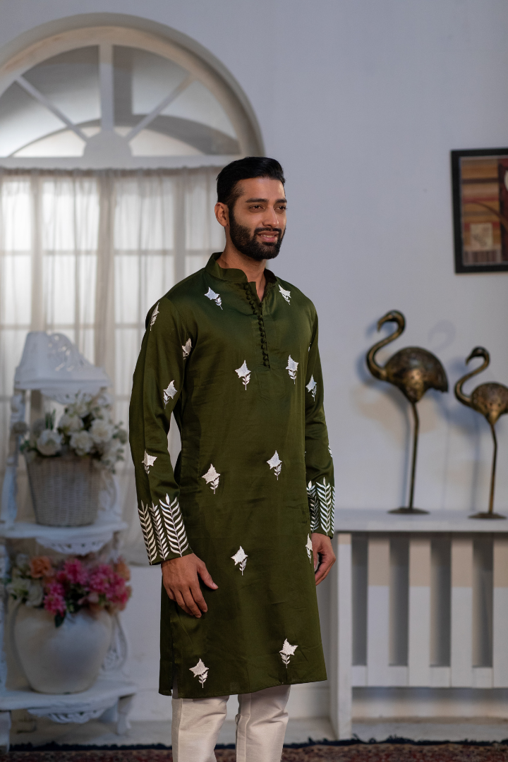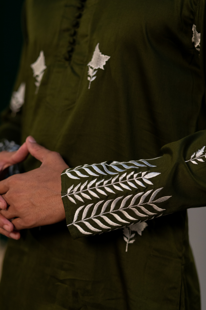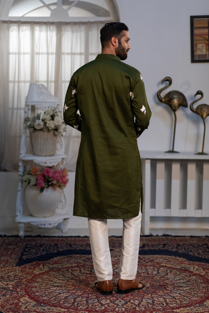 A refined white kurta with elegant embroidery on cotton satin. The pristine shade highlights the detailed needlework.