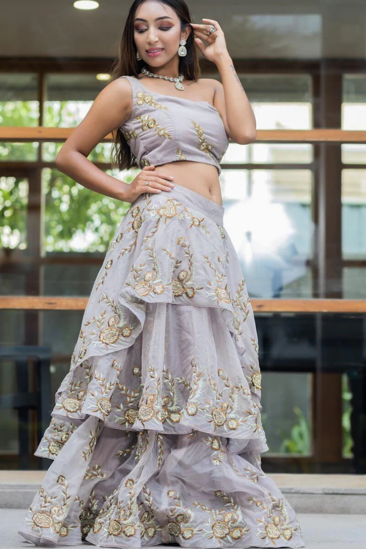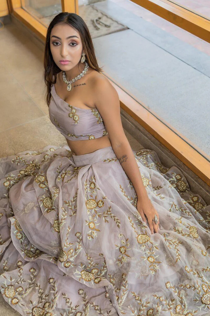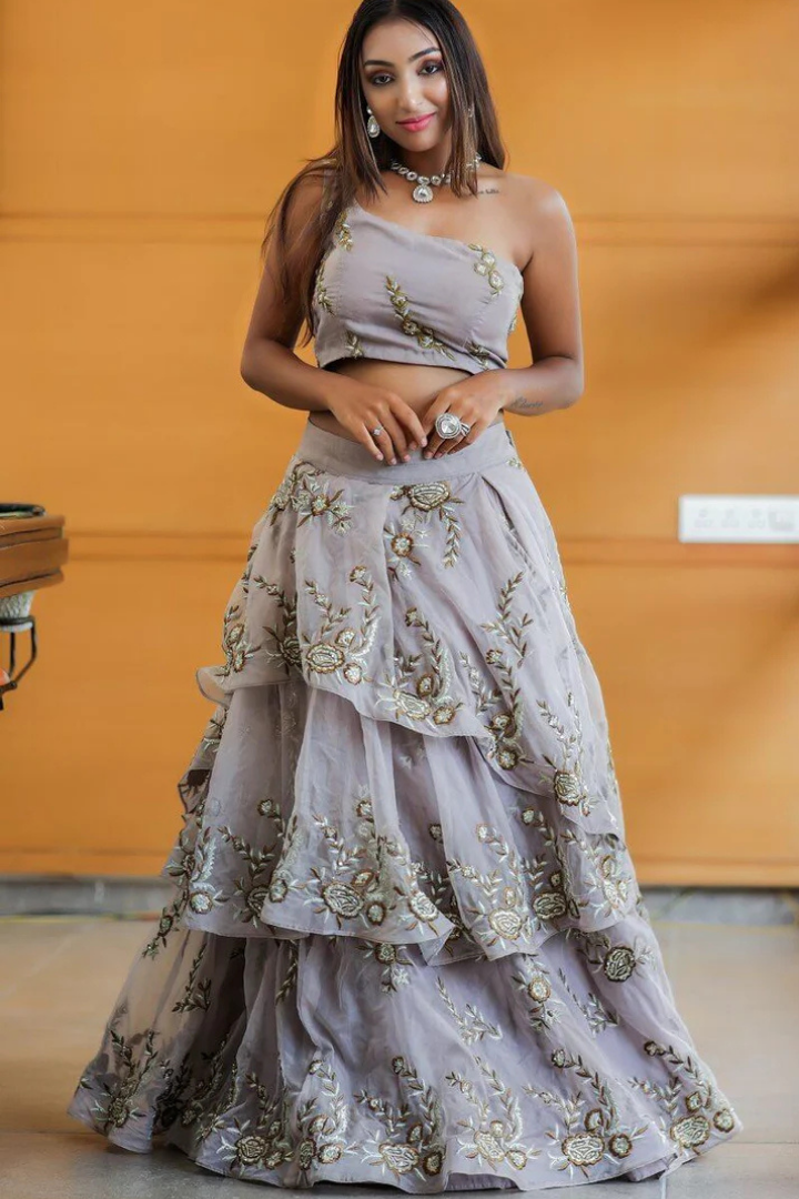 Onion Colour Organza Layers Lehenga With One Shoulder Blouse