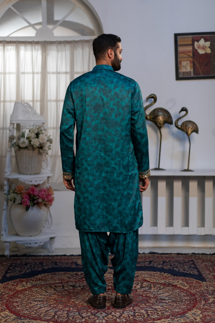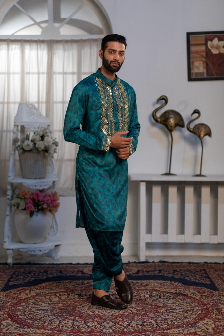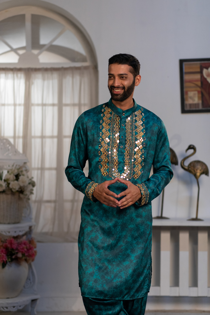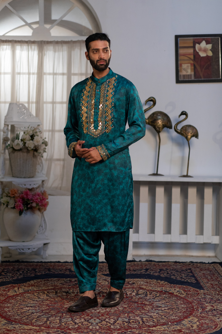 A classic set combining pine green with golden mirror work. The cotton satin blend ensures comfort with elegance.