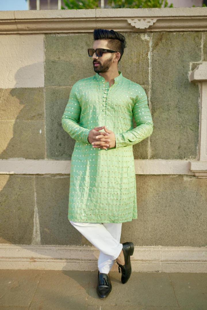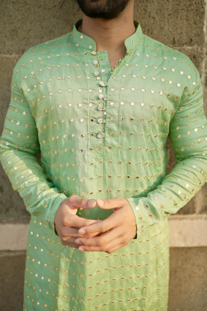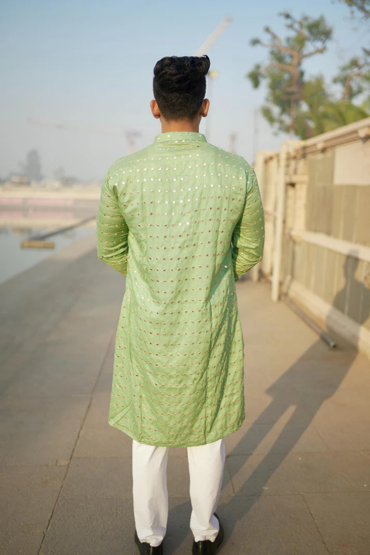 Elevate your style with our Pista Kaanch - Rayon Mirror Kurta, a chic ensemble that combines the freshness of pista green with intricate mirror embellishments. This pastel green kurta for men promises to be a stunning addition to your wardrobe, offering a perfect blend of traditional elegance and modern design.