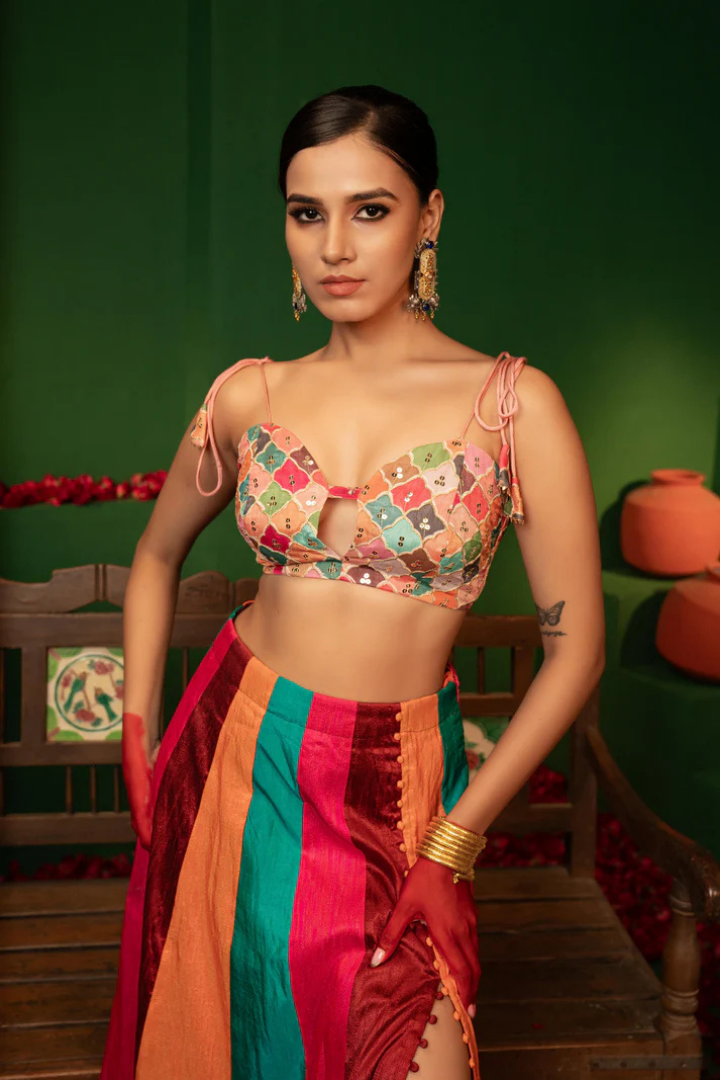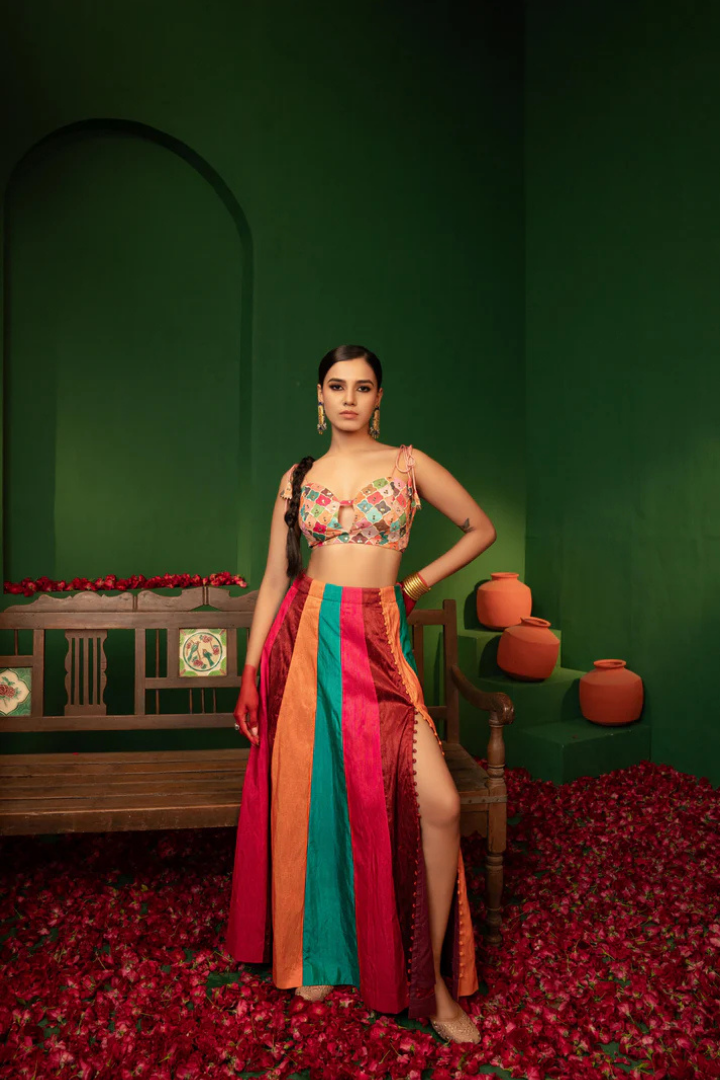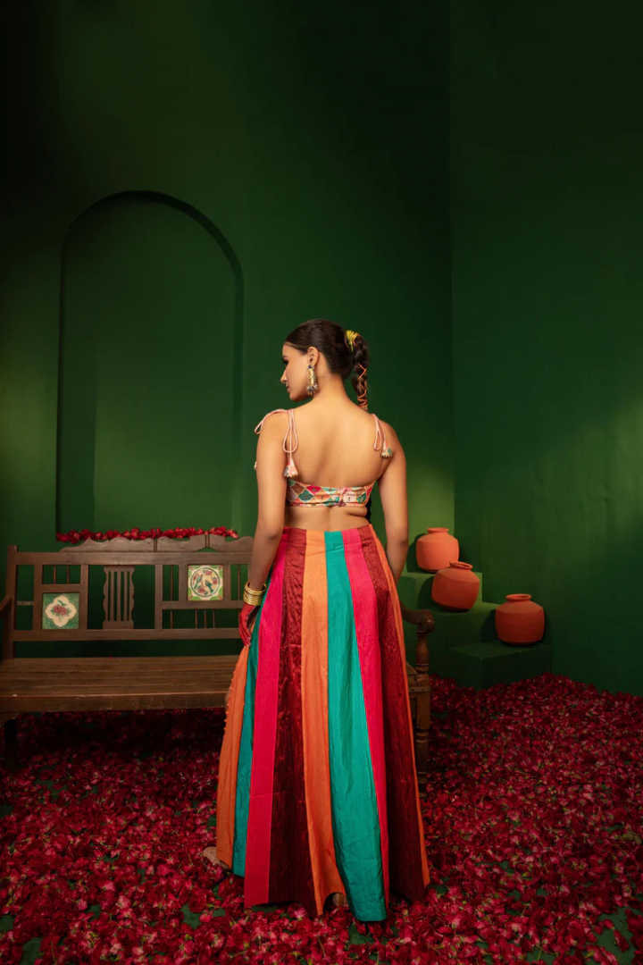 Prismatic Raw Silk & Georgette Crop Top Set with Silk Lehenga