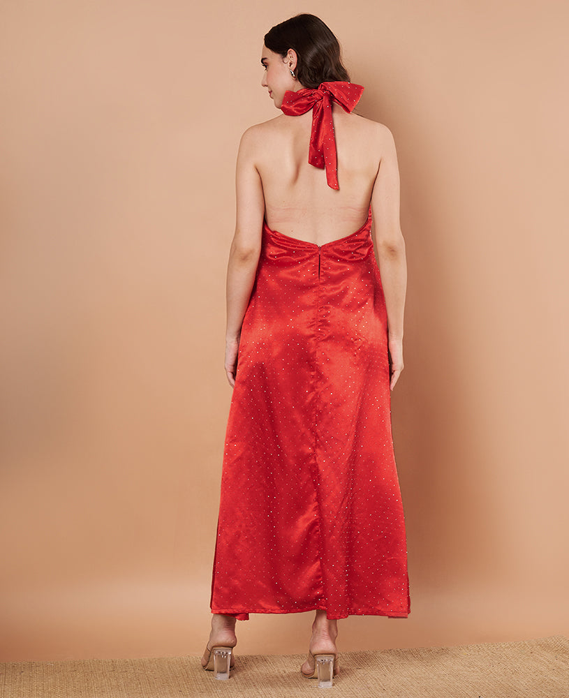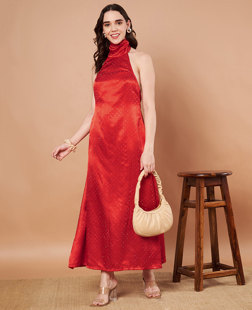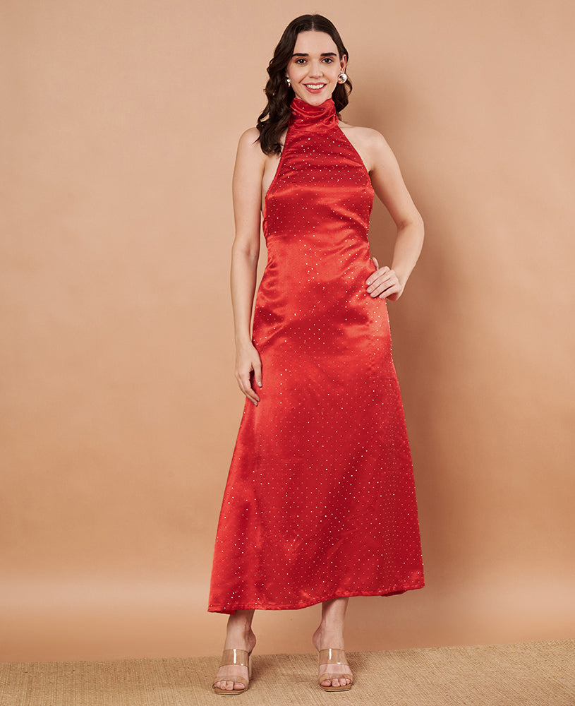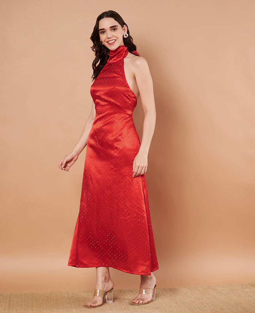 Red Siroski Satin Frock is made of satin with siroski work for shine. The fabric is soft with a slight shine. The skirt is flared and moves easily as you walk. The top part fits comfortably, not tight. It’s light enough to wear for many hours without trouble. You can wear it to weddings, parties, or family events. Small earrings finish the look.