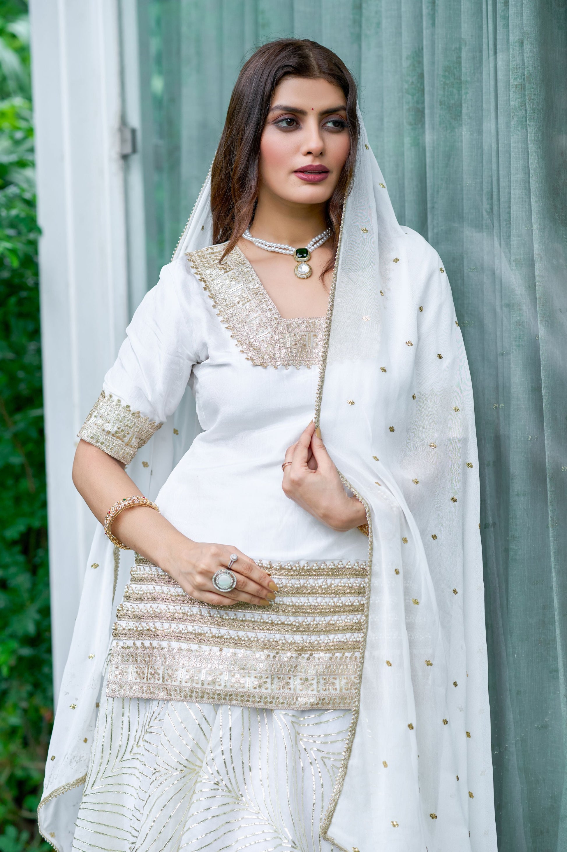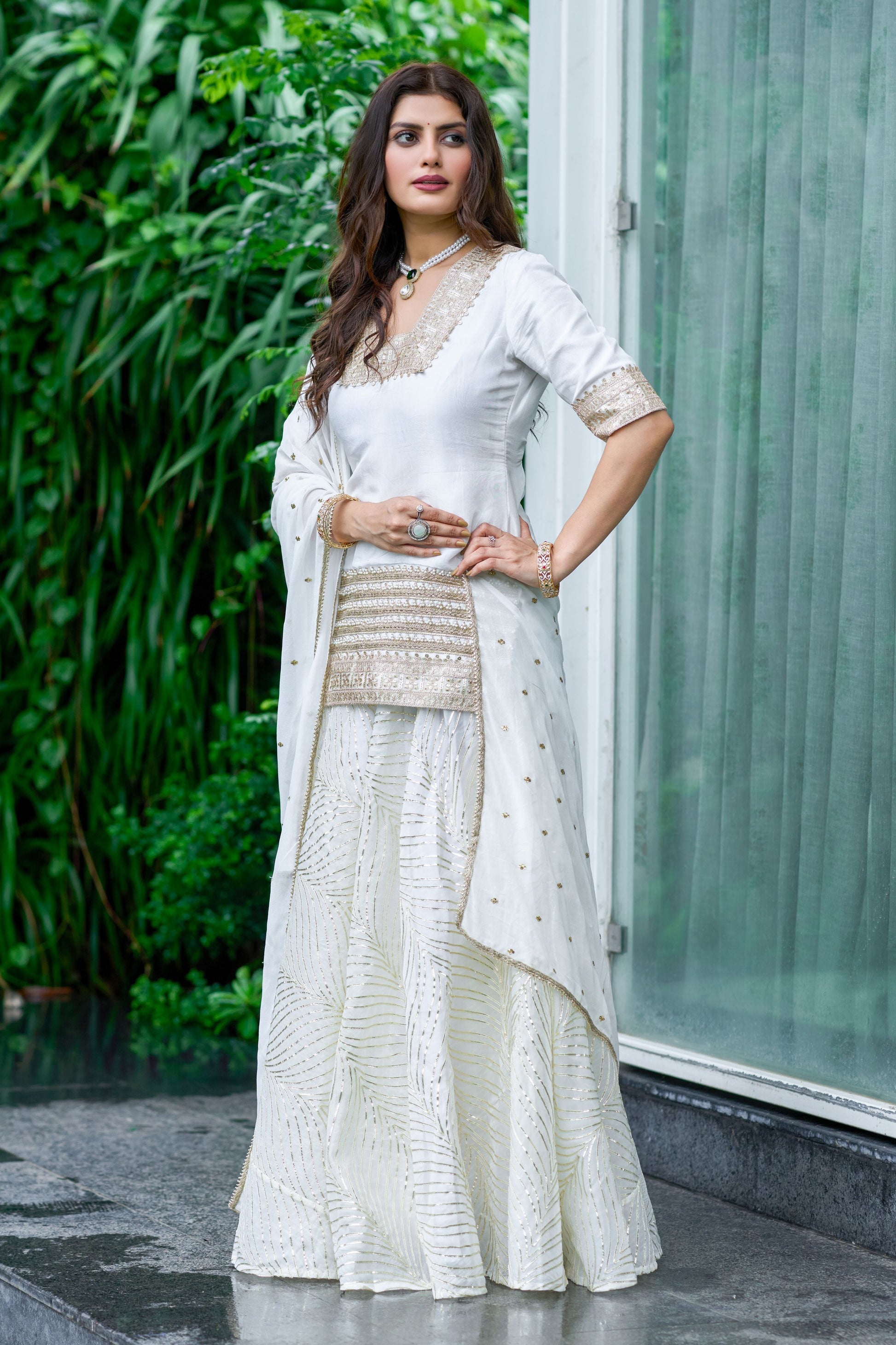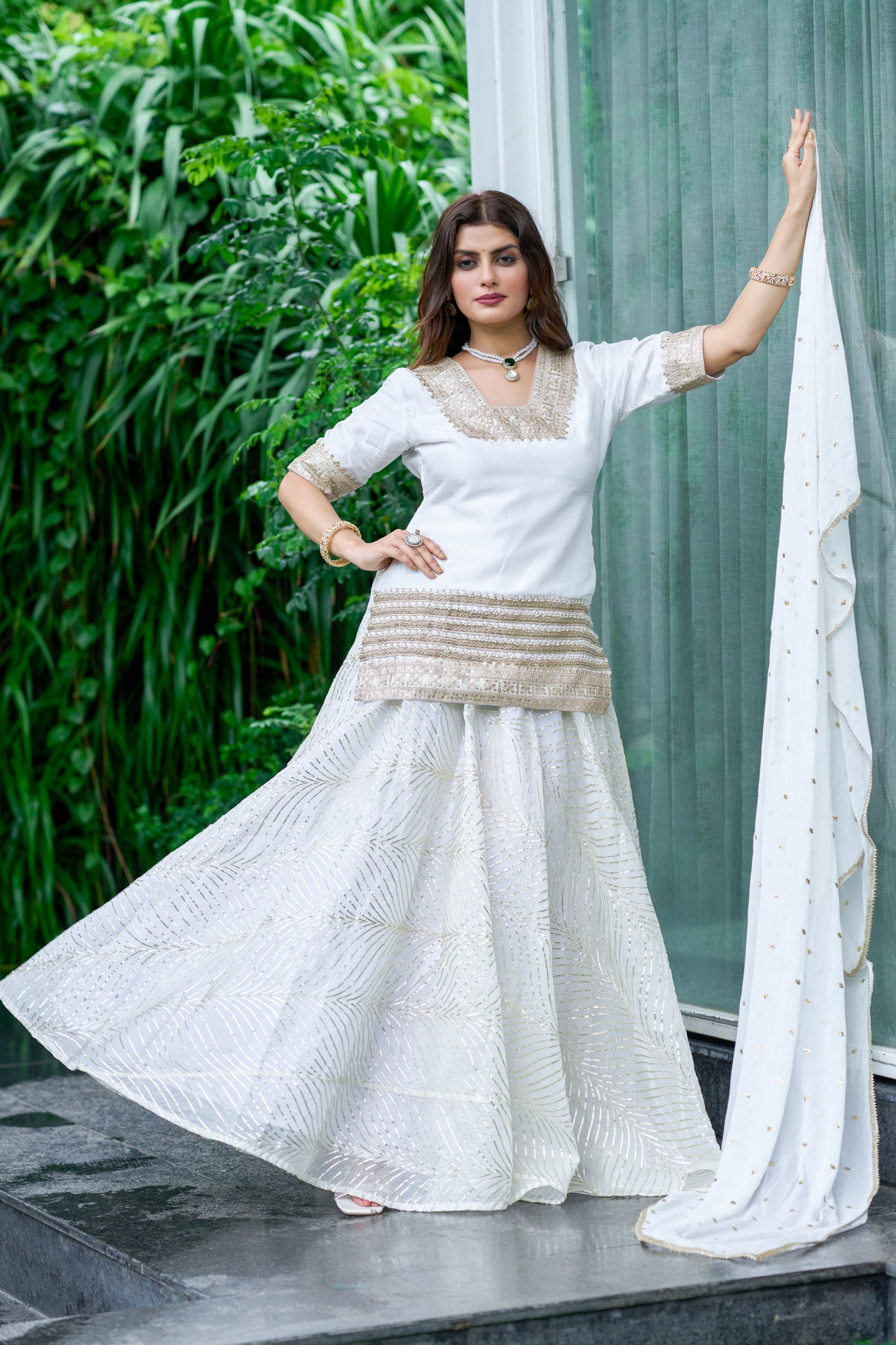 Safed Gota Lehenga is made of soft Mal cotton fabric with gota work. The white color makes it look clean and elegant. The skirt flares out so it moves when you walk. Easy to wear all day. Good for weddings, puja ceremonies, or family functions. Flats and small jewelry complete the look.