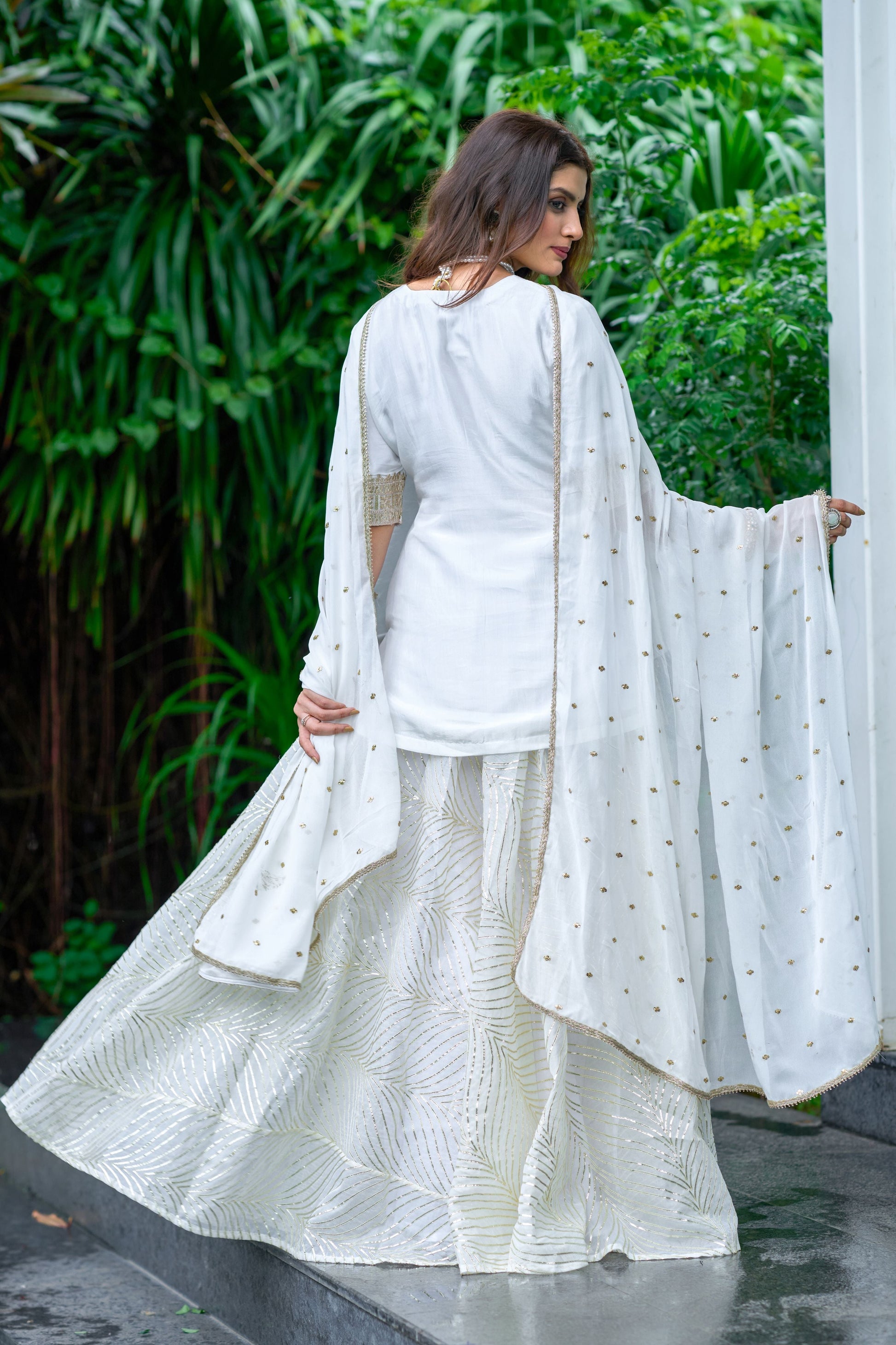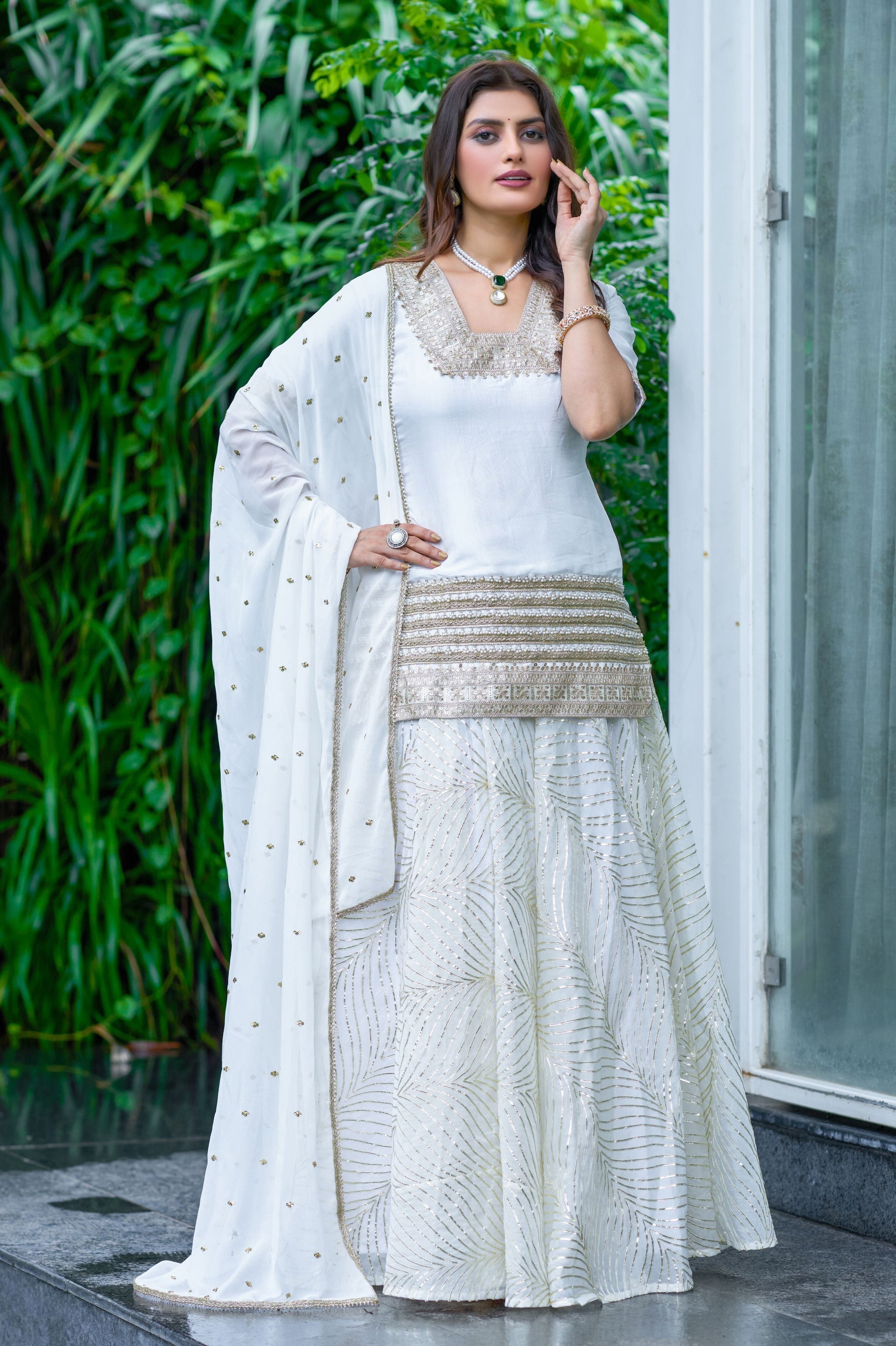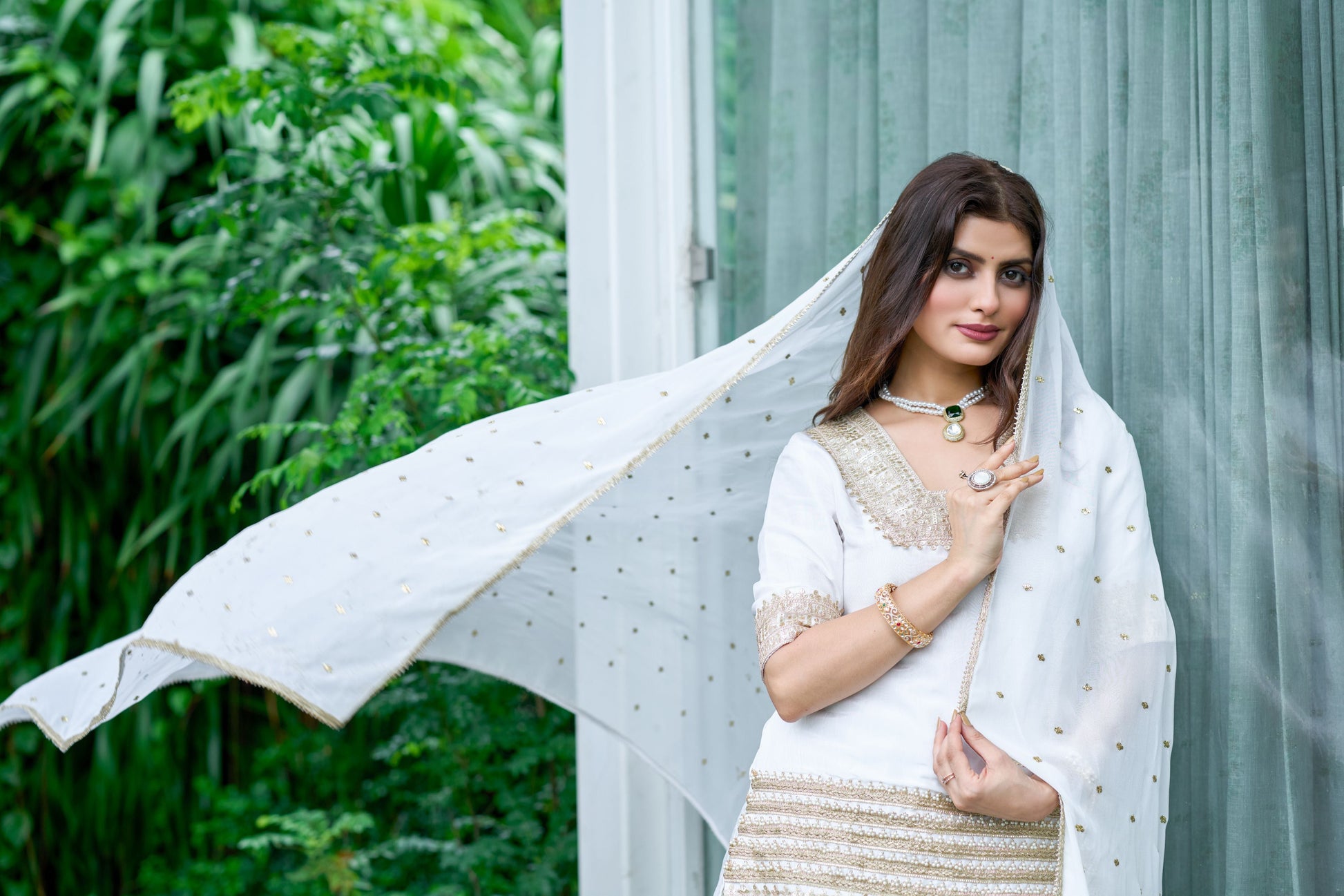Safed Gota Lehenga is made of soft Mal cotton fabric with gota work. The white color makes it look clean and elegant. The skirt flares out so it moves when you walk. Easy to wear all day. Good for weddings, puja ceremonies, or family functions. Flats and small jewelry complete the look.