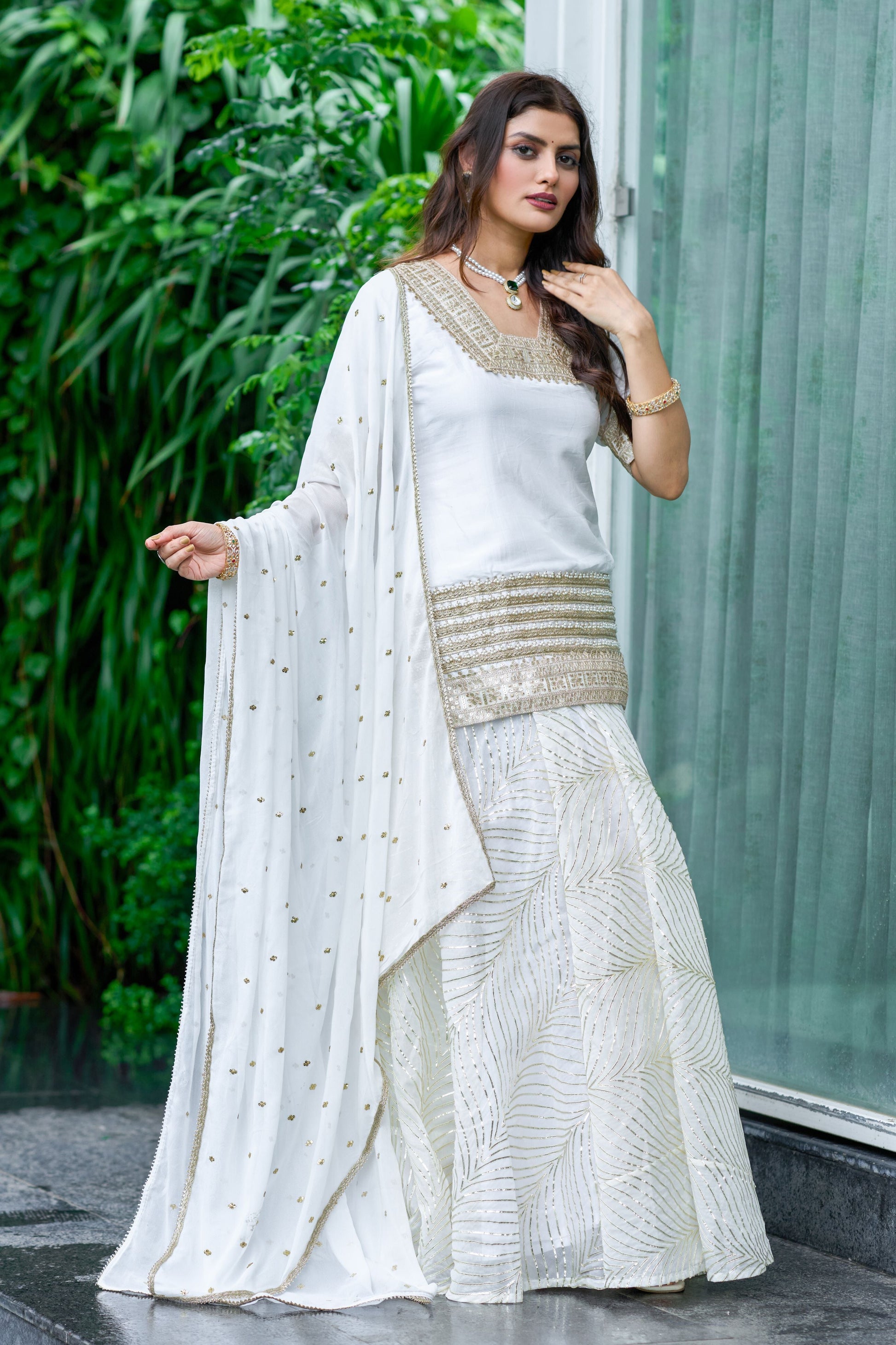 Red Silk Blouse & Net Worked Sharara With Feather Dupatta