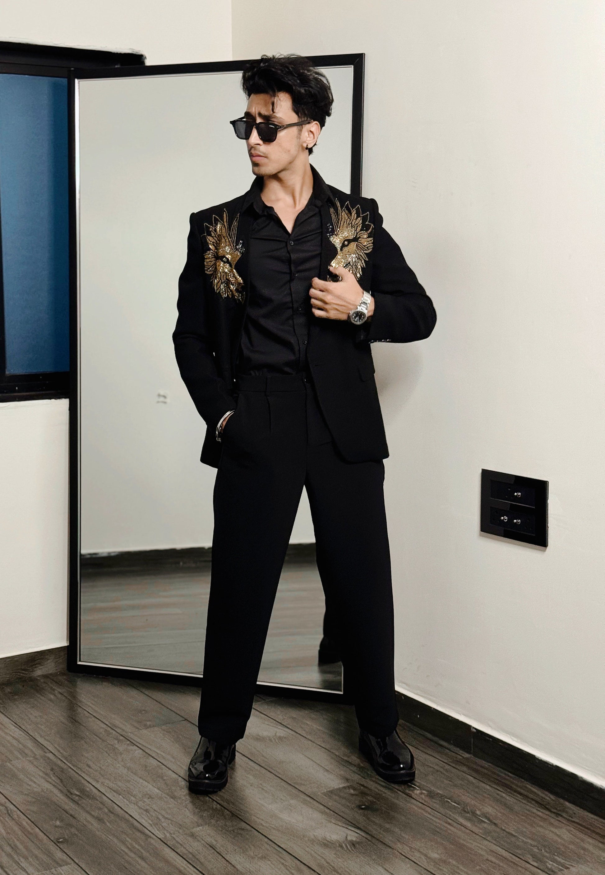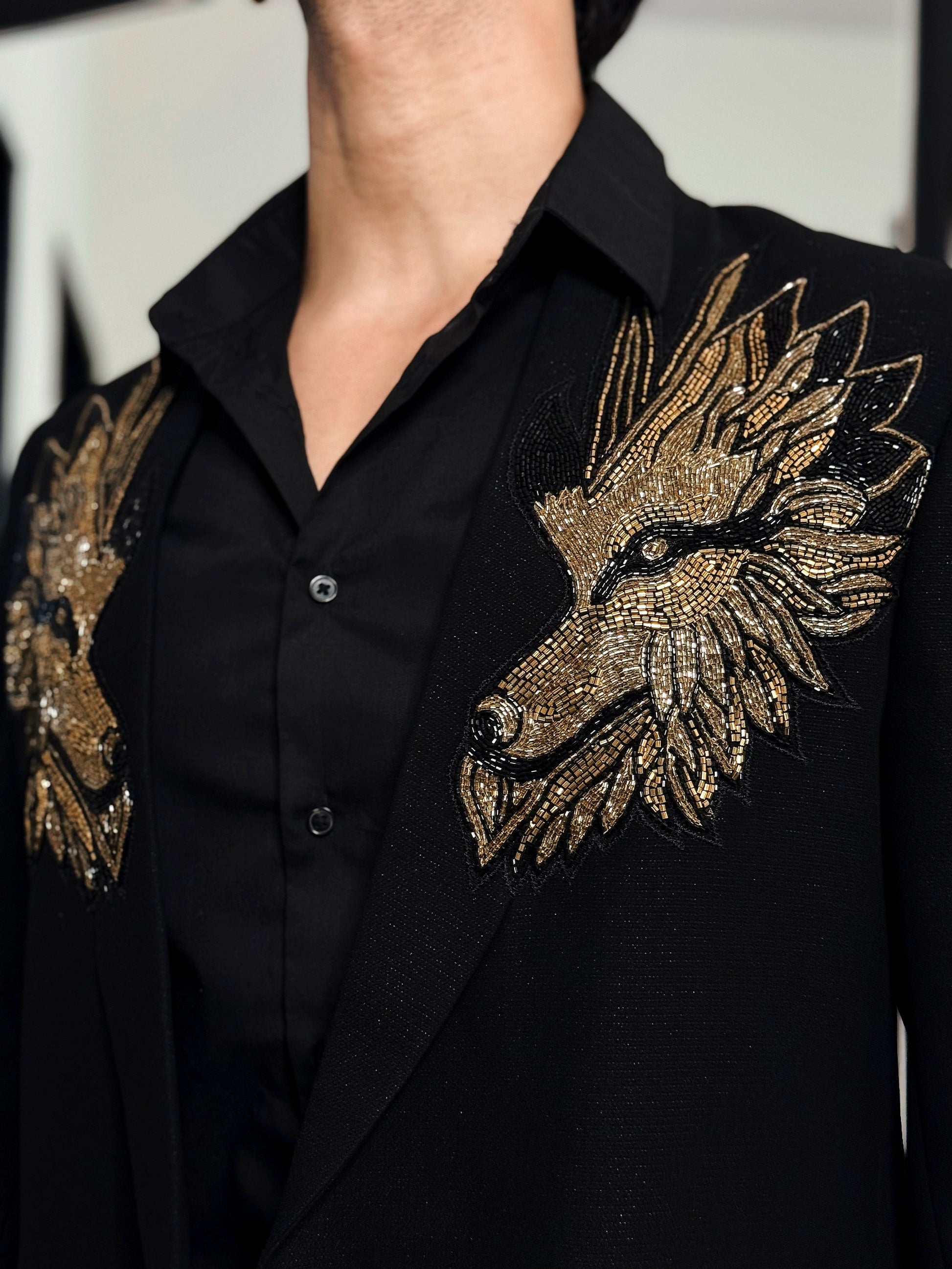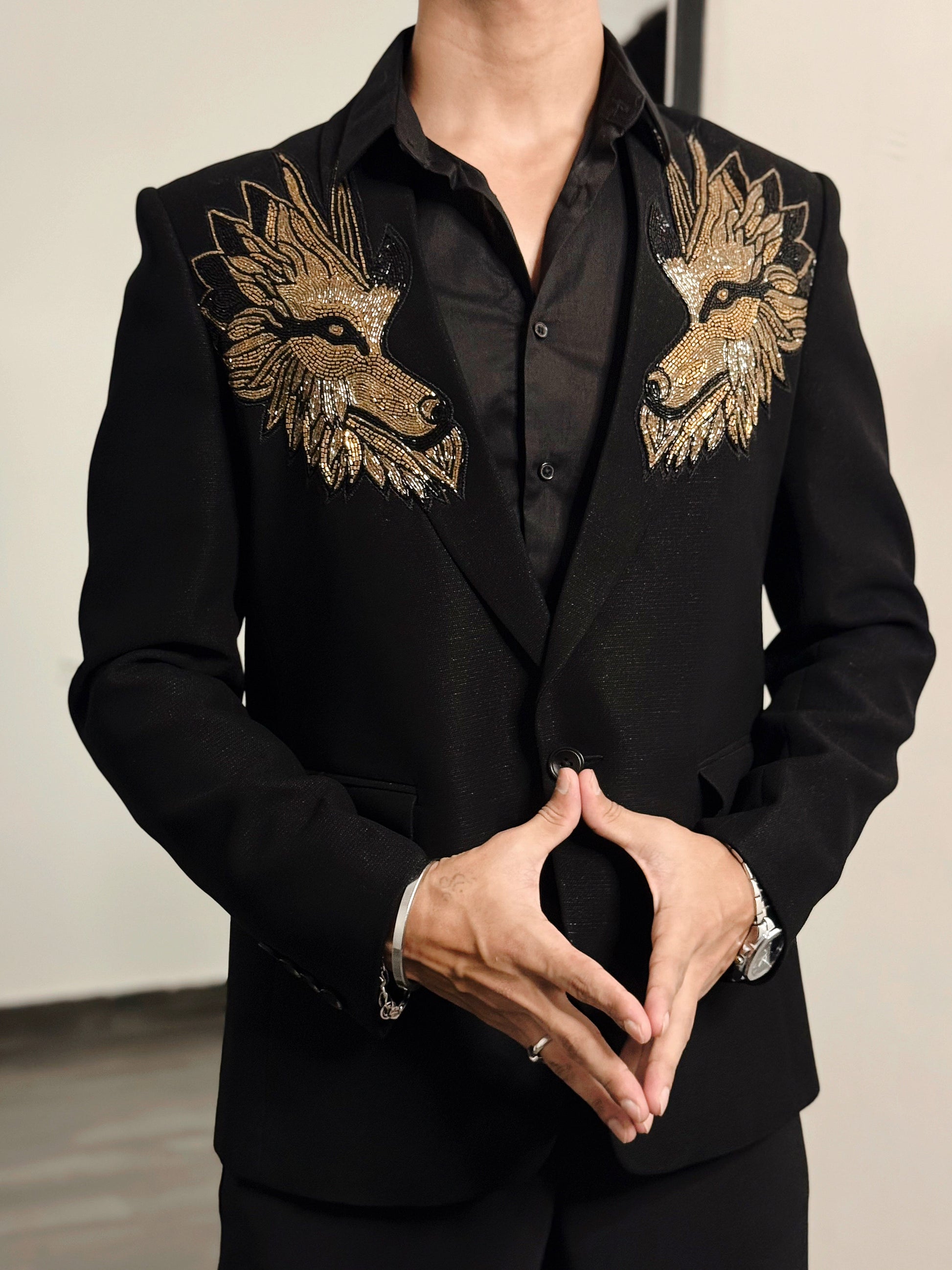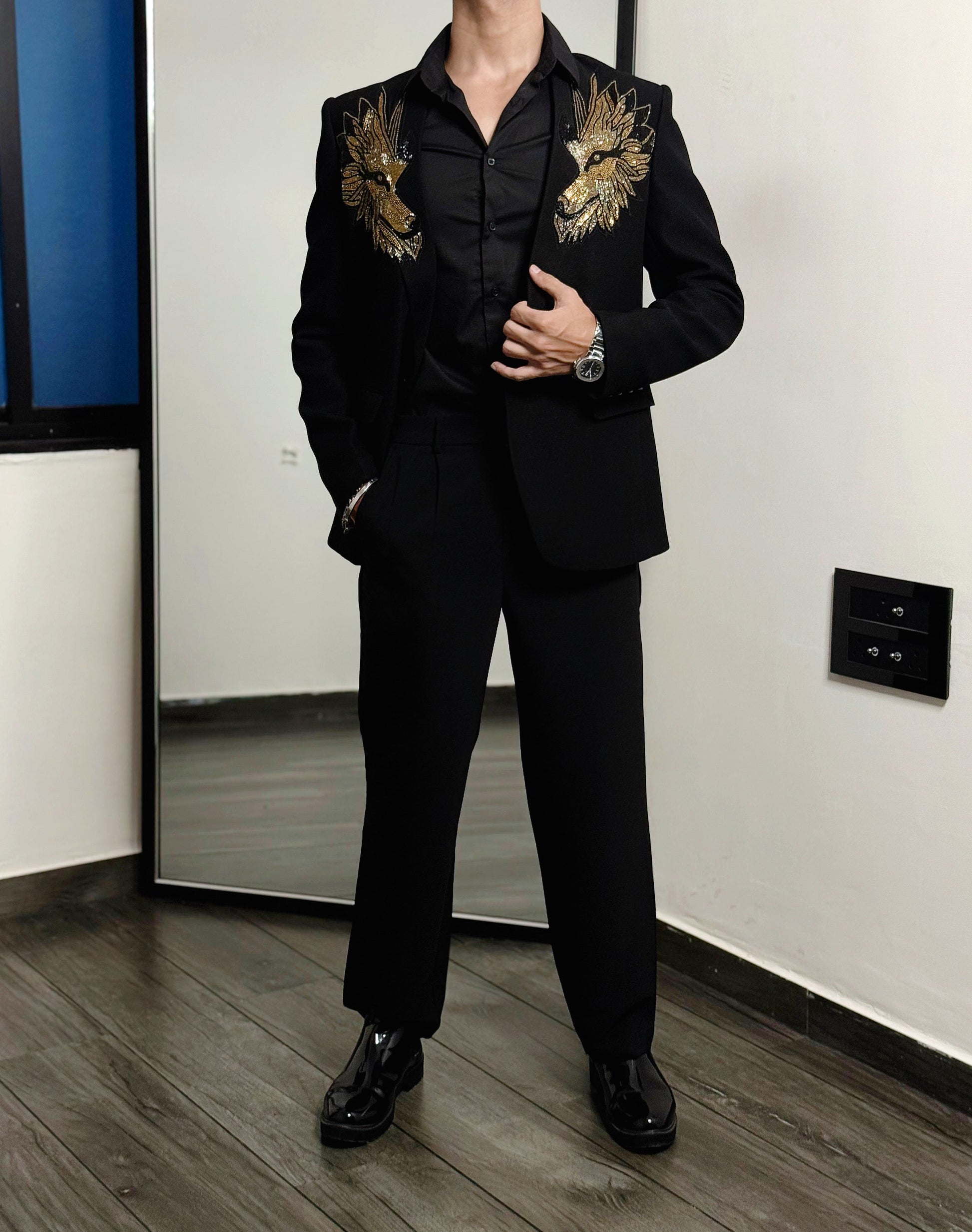 Small lion blazer with pants is a matching set. The blazer is neat and has a simple shape. The pants are simple and feel good to wear. The fabric has a small shine. This outfit works for a party or any formal occasion.