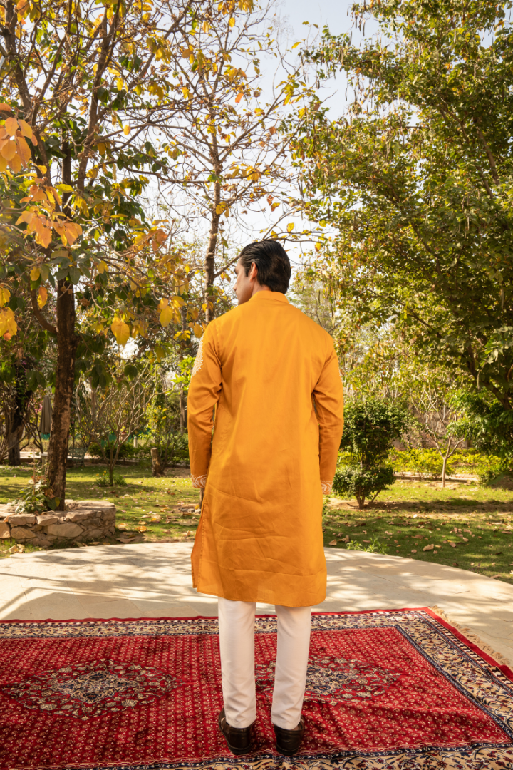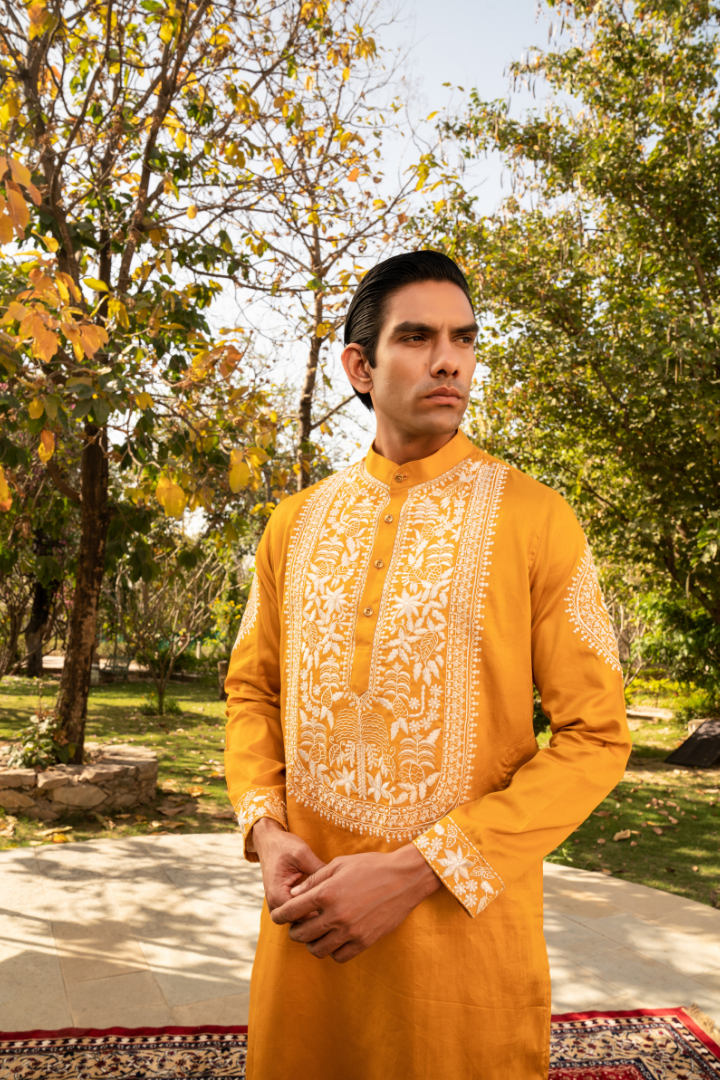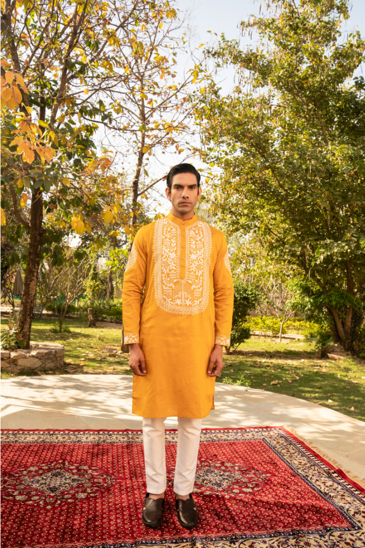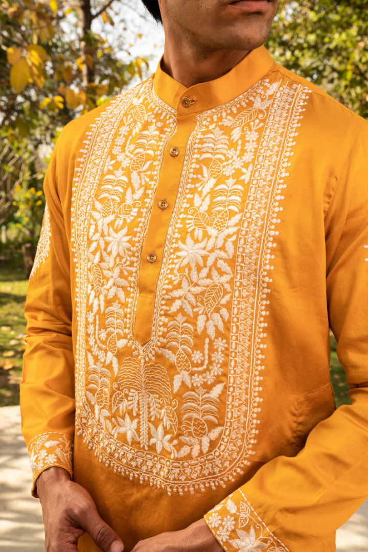 Exude understated elegance with this oyster yellow kurta. The soft, muted yellow hue offers a sophisticated alternative to brighter shades, perfect for those who prefer a more subdued look.