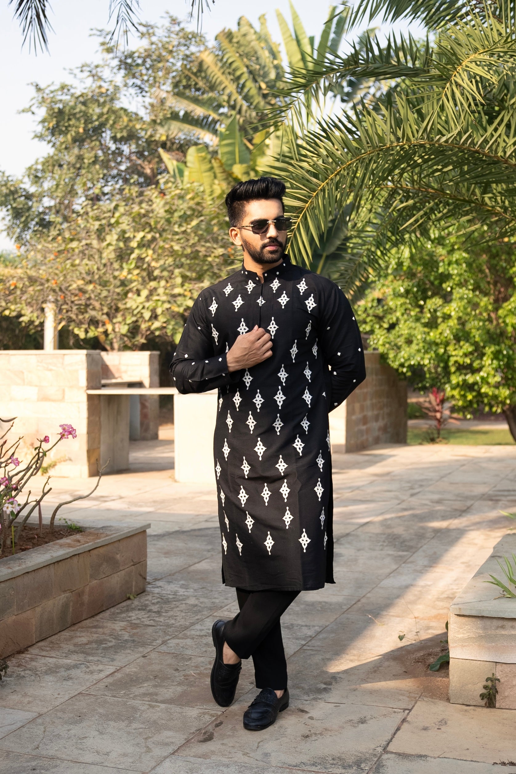 A perfect fusion of sophistication and tradition, the Soul Black White Embroidery Silk Kurta is designed for the modern man who values elegance. Crafted with rich silk fabric and adorned with intricate white embroidery, this kurta exudes timeless charm, making it ideal for festive occasions, cultural gatherings, and grand celebrations.