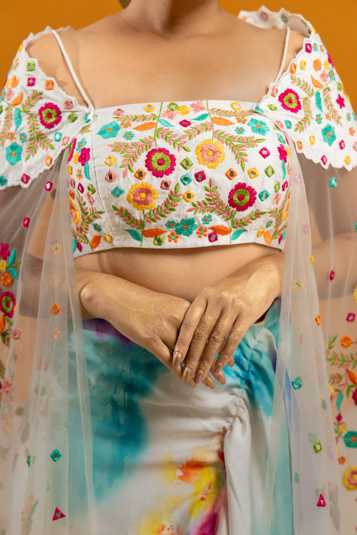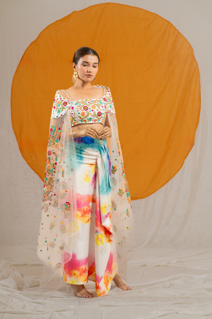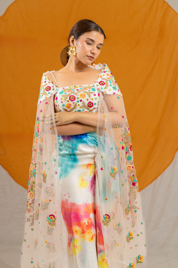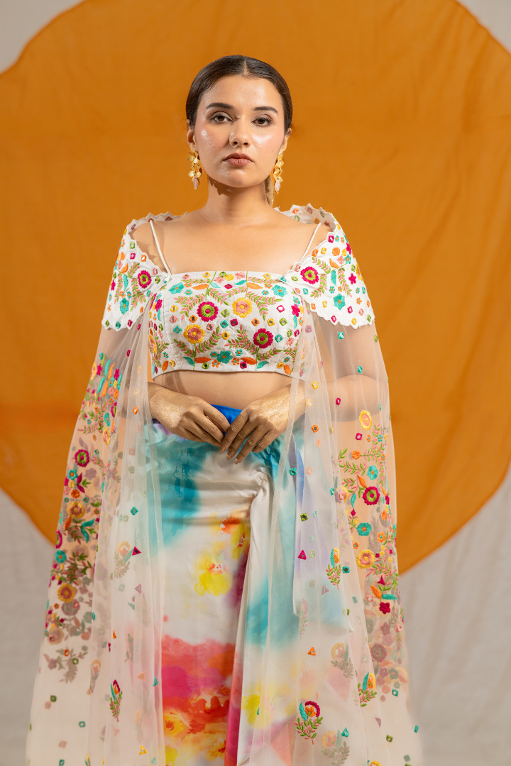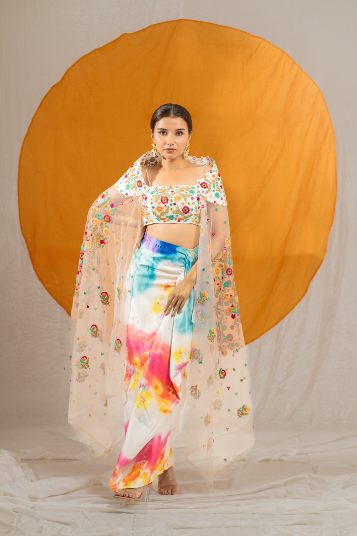 Splashy Draped Skirt with Crop Top and Net Shrug Dupatta
