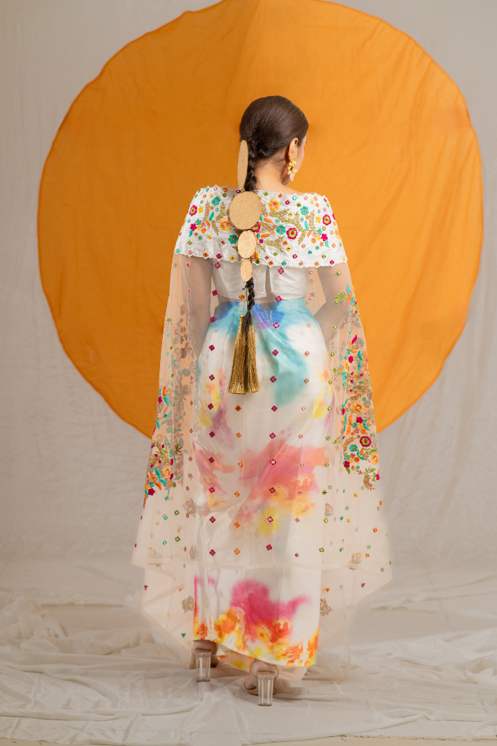 Step into the spotlight with our Splashy Draped Skirt ensemble. Embrace the fusion of contemporary design and traditional elegance, becoming the epitome of style and sophistication.