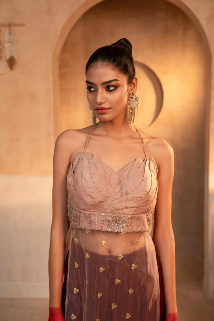 Red Silk Blouse & Net Worked Sharara With Feather Dupatta