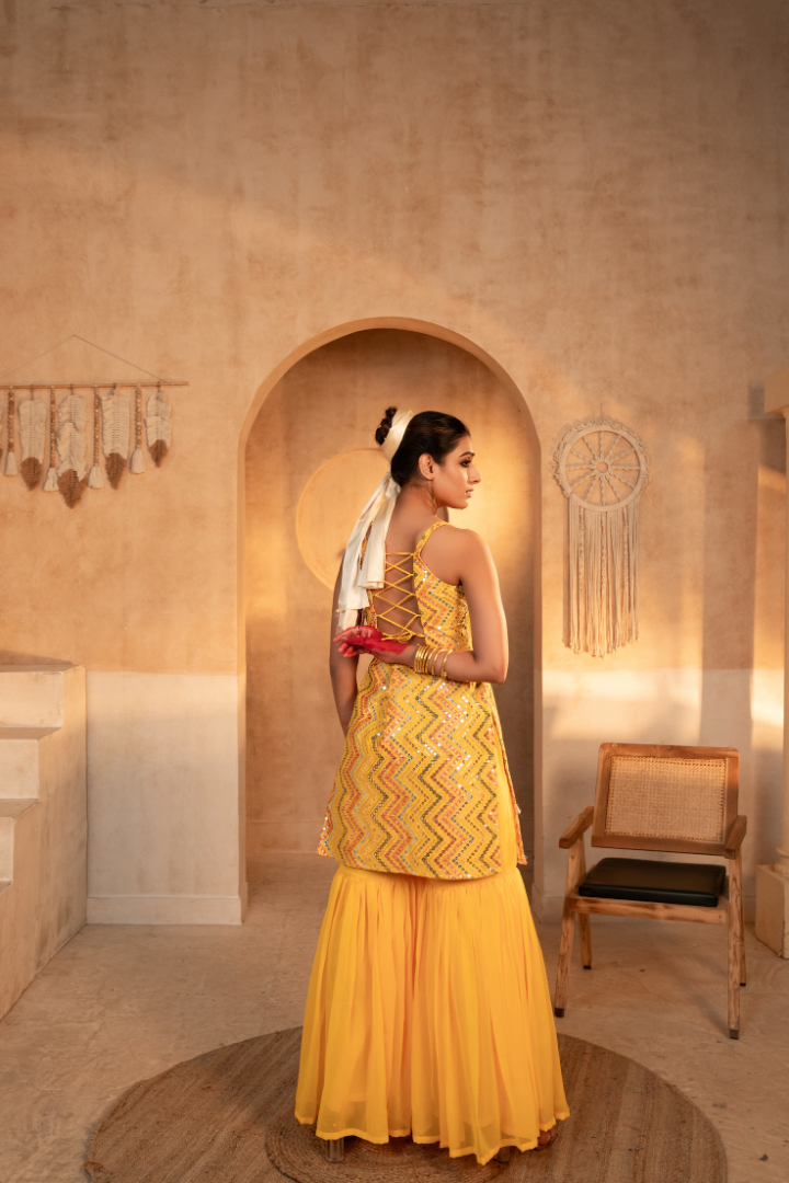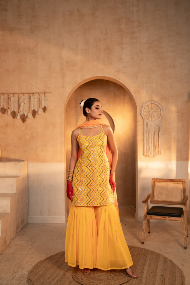 Embrace the vibrant charm of the Tammanna - Peela Nimbu Sharara Set. Crafted from the luxurious georgette fabric, this stunning ensemble features a captivating yellow hue that radiates an aura of sunshine. The sharara silhouette, with its flowing and flared legs, creates a mesmerizing look that will leave a lasting impression. Whether you're attending a festive celebration or elevating your everyday style, this Tammanna creation is a versatile choice that will make you feel truly radiant.