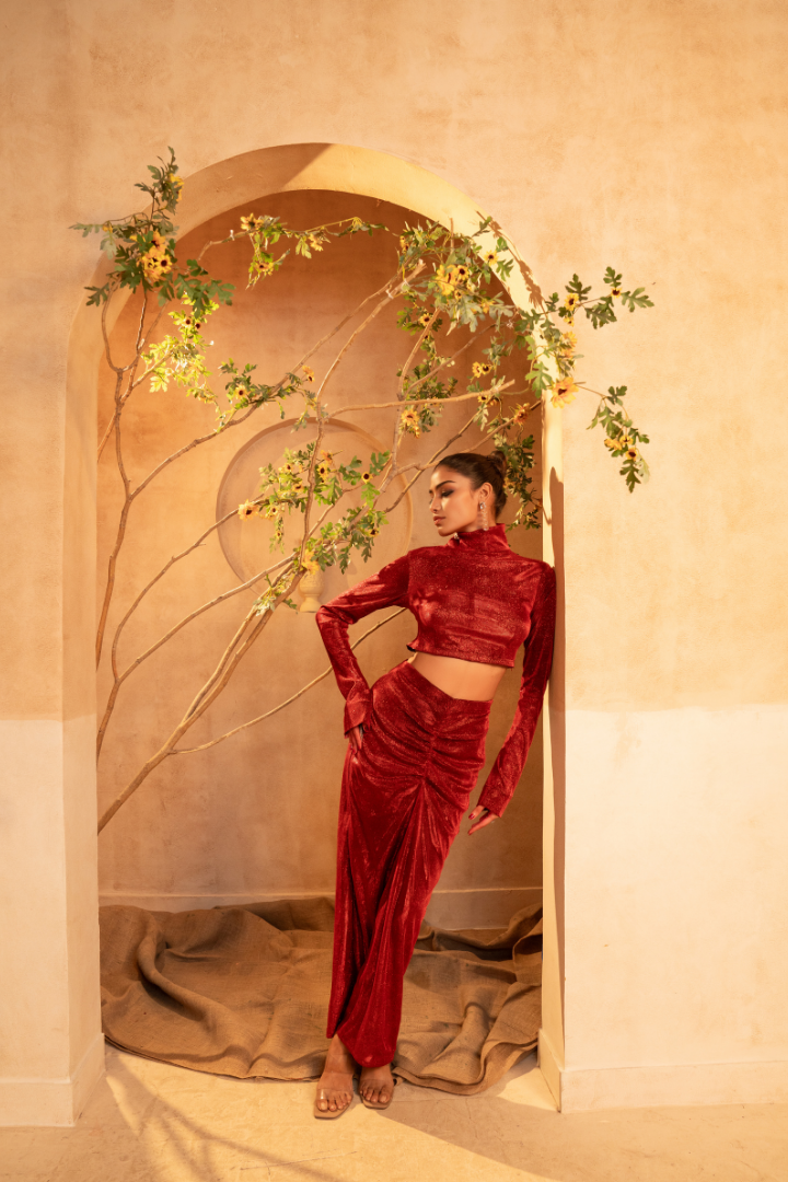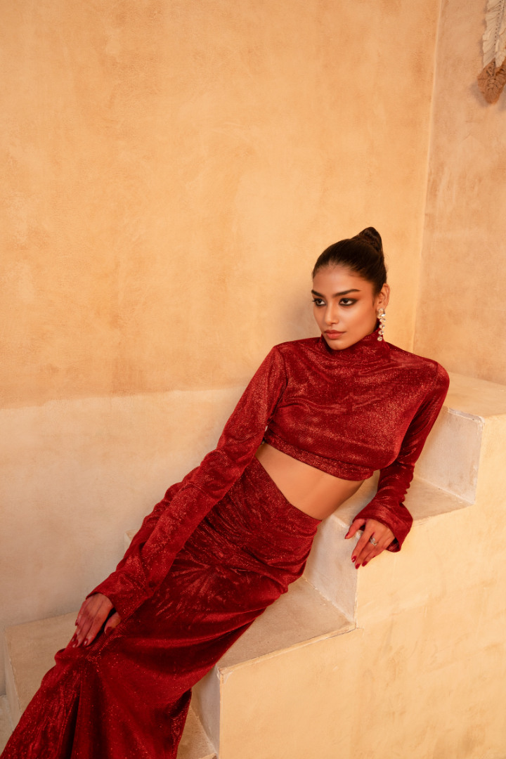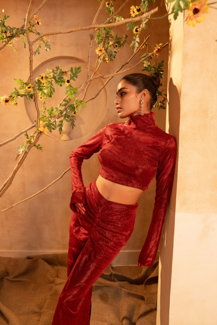 Embrace the captivating charm of the Tammanna - Red Forest Set. Crafted from the finest imported fabric, this stunning ensemble features a rich, deep red hue that radiates an aura of regal elegance. The harmonious set, which includes a top and bottom, creates a mesmerizing look that effortlessly combines traditional craftsmanship with modern sensibilities. Whether you're attending a cultural celebration or elevating your everyday ethnic wear, this Tammanna creation is a versatile choice that will make you feel truly remarkable.