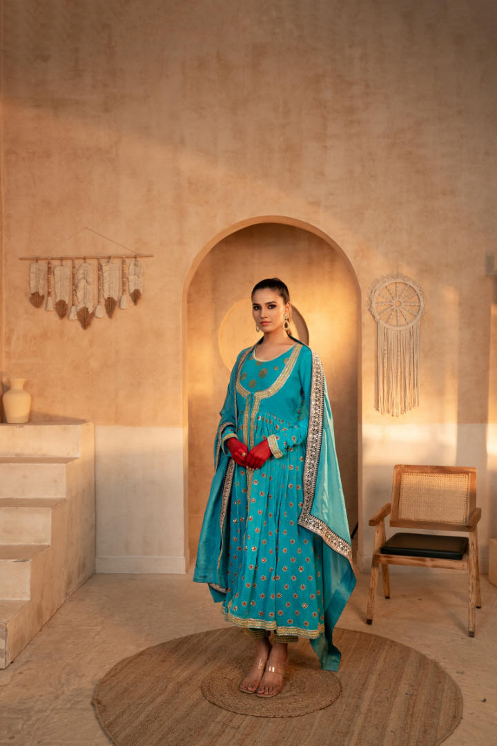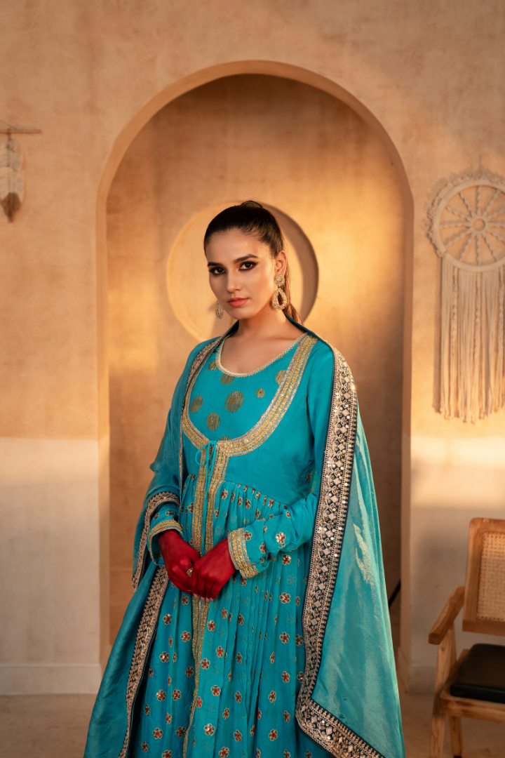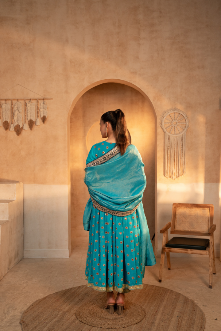 Experience the spiritual essence of Ruhaniyat with this ethereal Anarkali dress by Tammanna. Crafted from soft georgette, this ensemble captures the essence of spirituality in its design and flow.