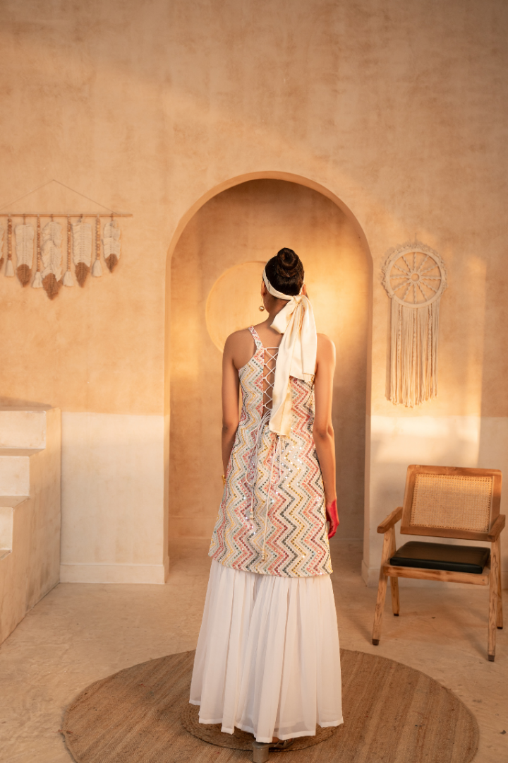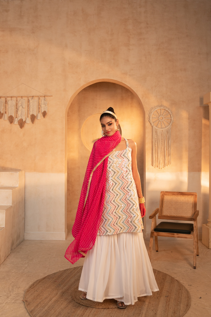 Embrace the timeless elegance of the Tammanna - Safed Ishq Sharara Set. Crafted from the luxurious georgette fabric, this stunning ensemble features a serene white hue that radiates a sense of purity and grace. The sharara silhouette, with its flowing and flared legs, creates a mesmerizing look that will leave a lasting impression. Whether you're attending a special occasion or elevating your everyday style, this Tammanna creation is a versatile choice that will make you feel truly captivating.