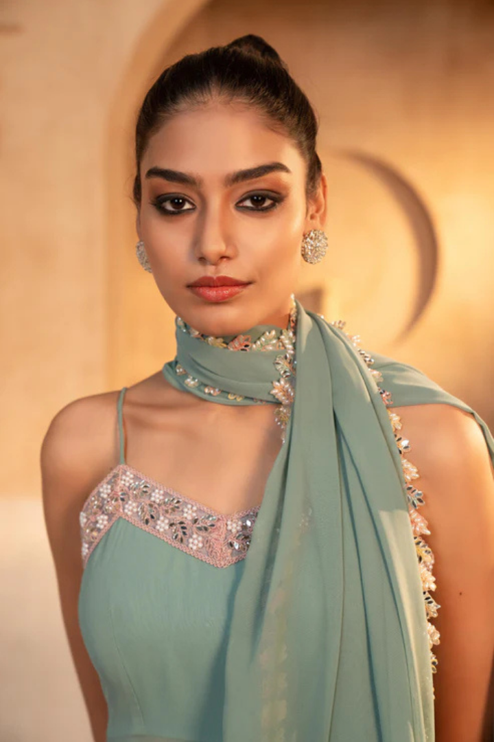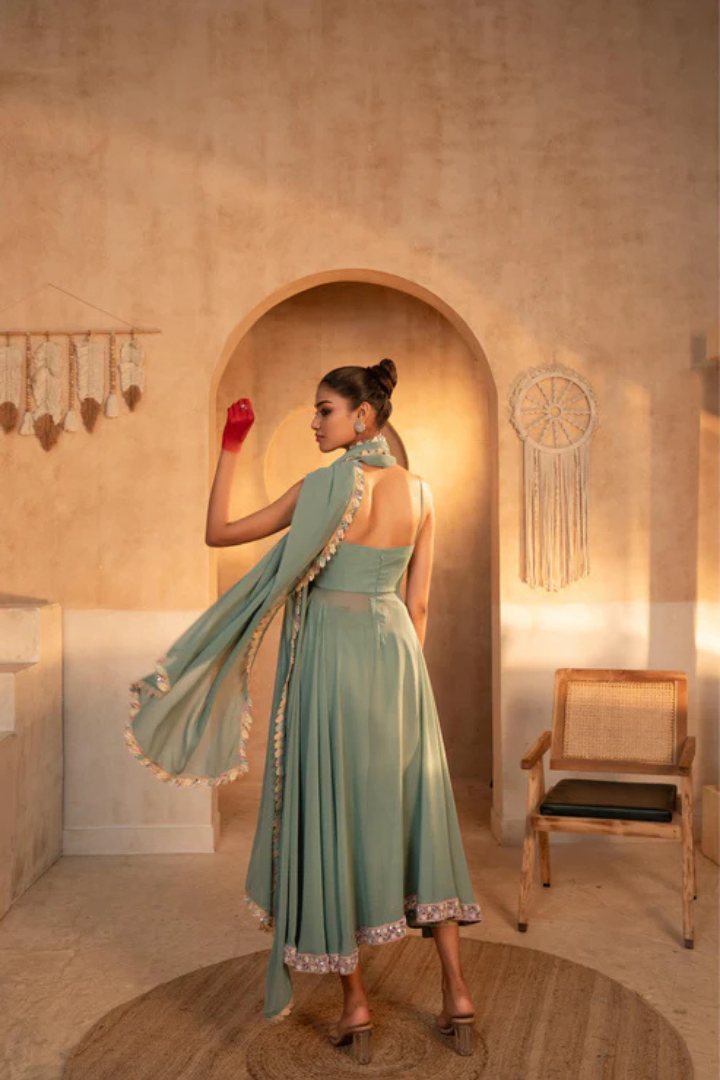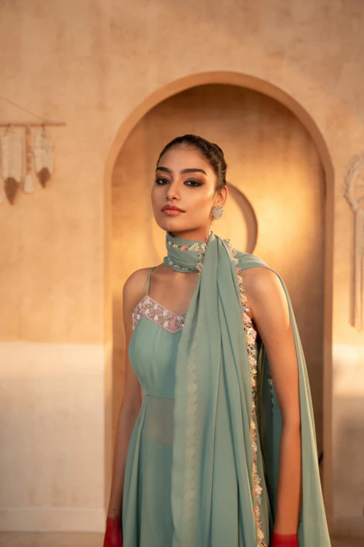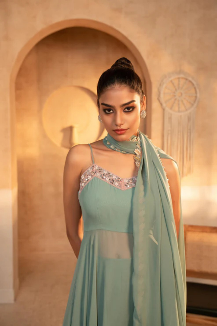 Let your Soch (thoughts) inspire you in this elegant georgette Anarkali by Tammanna. The flowing silhouette and thoughtful design elements create a look that's both introspective and stylish.