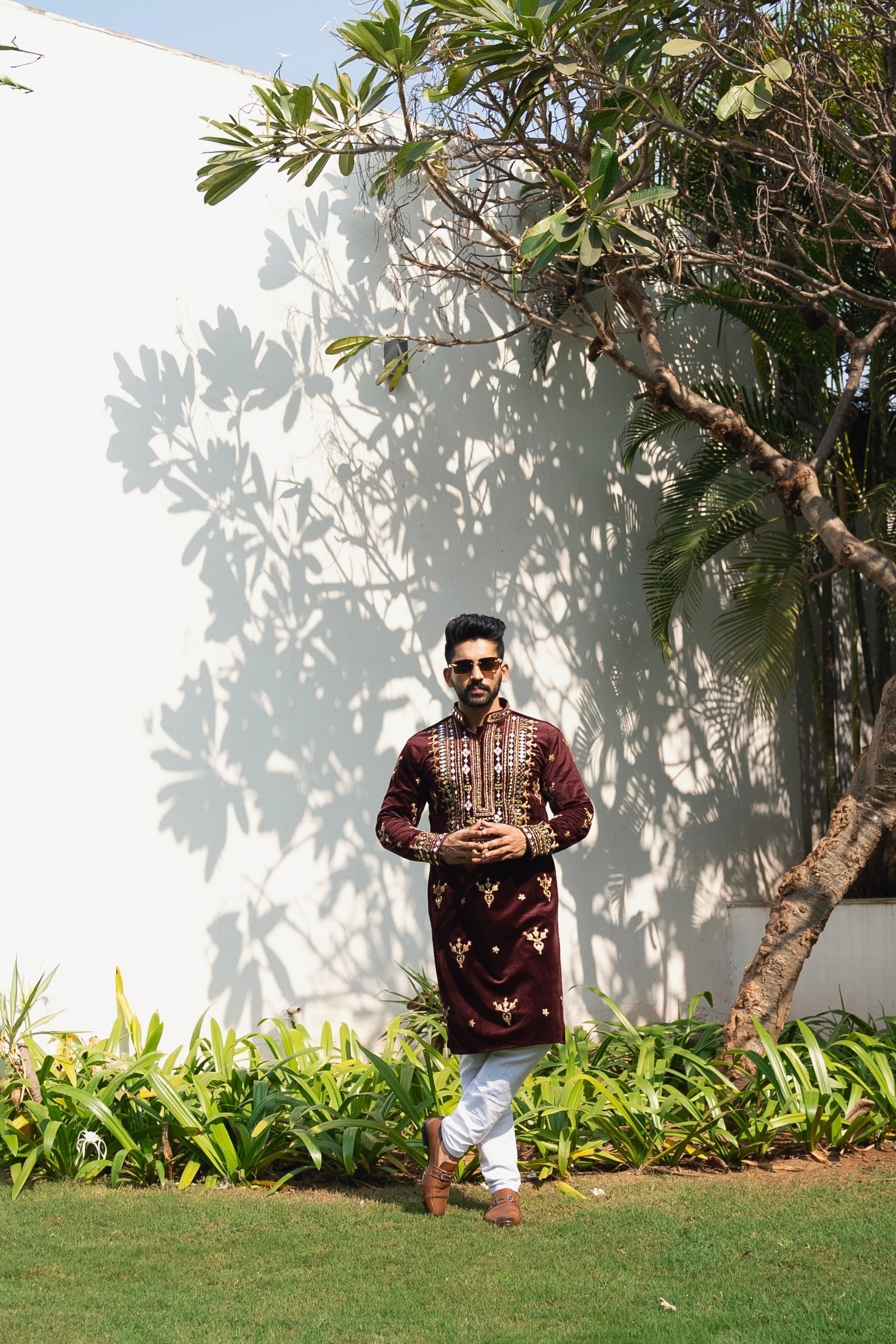 The Terracotta Brown Mirror Embroidered Kurta has mirror work on the front. The brown shade is warm and earthy. It has a straight relaxed cut, so you can move without worry. The fabric is smooth and light, comfortable for many hours. Good pick for weddings, festive days, or family functions. Combine with churidar or straight pants for a neat look.