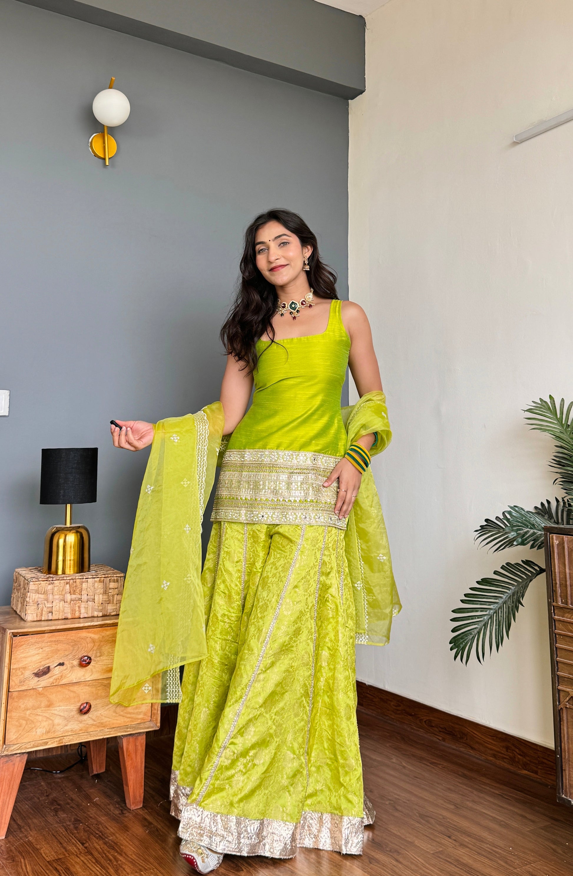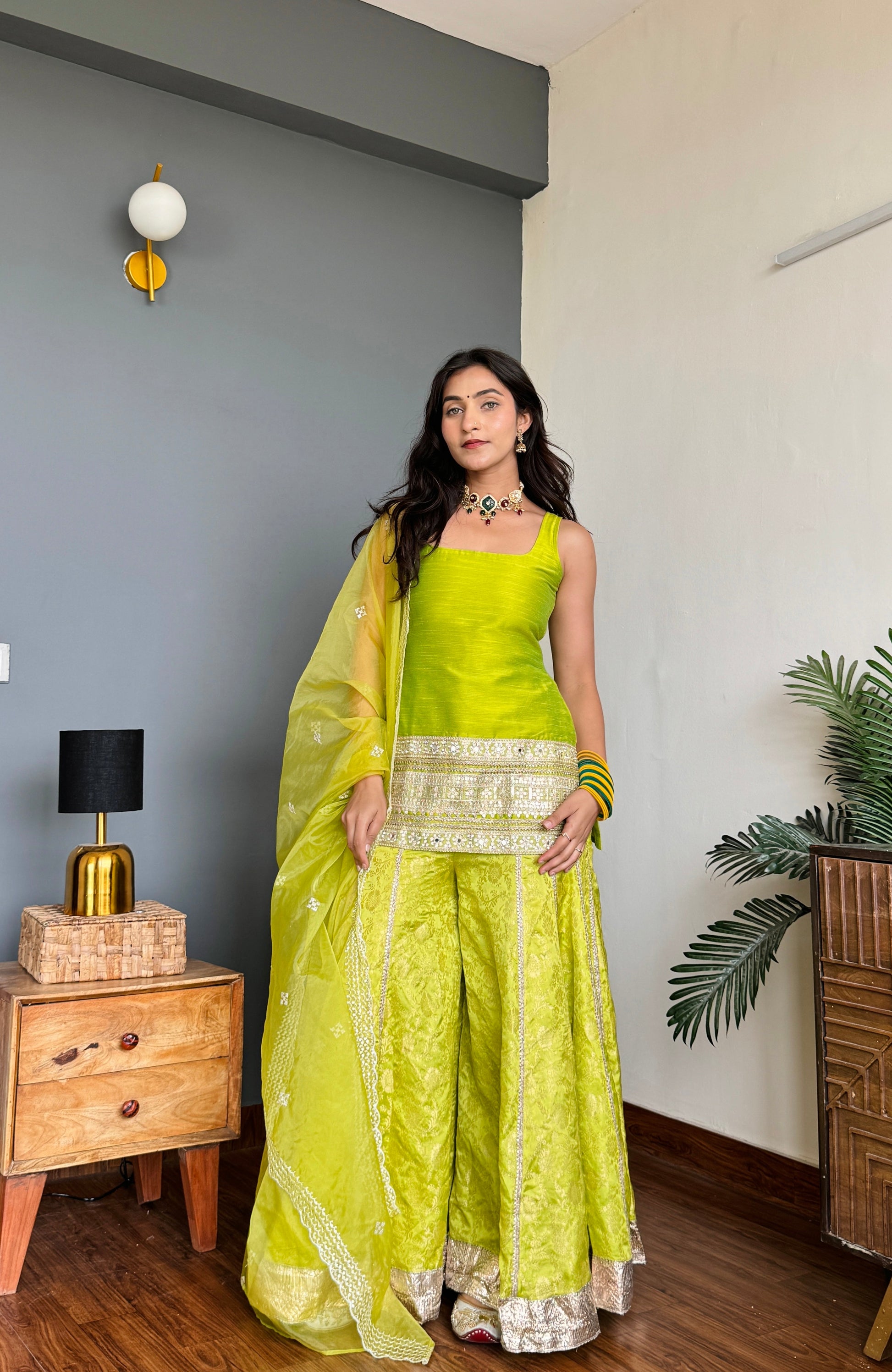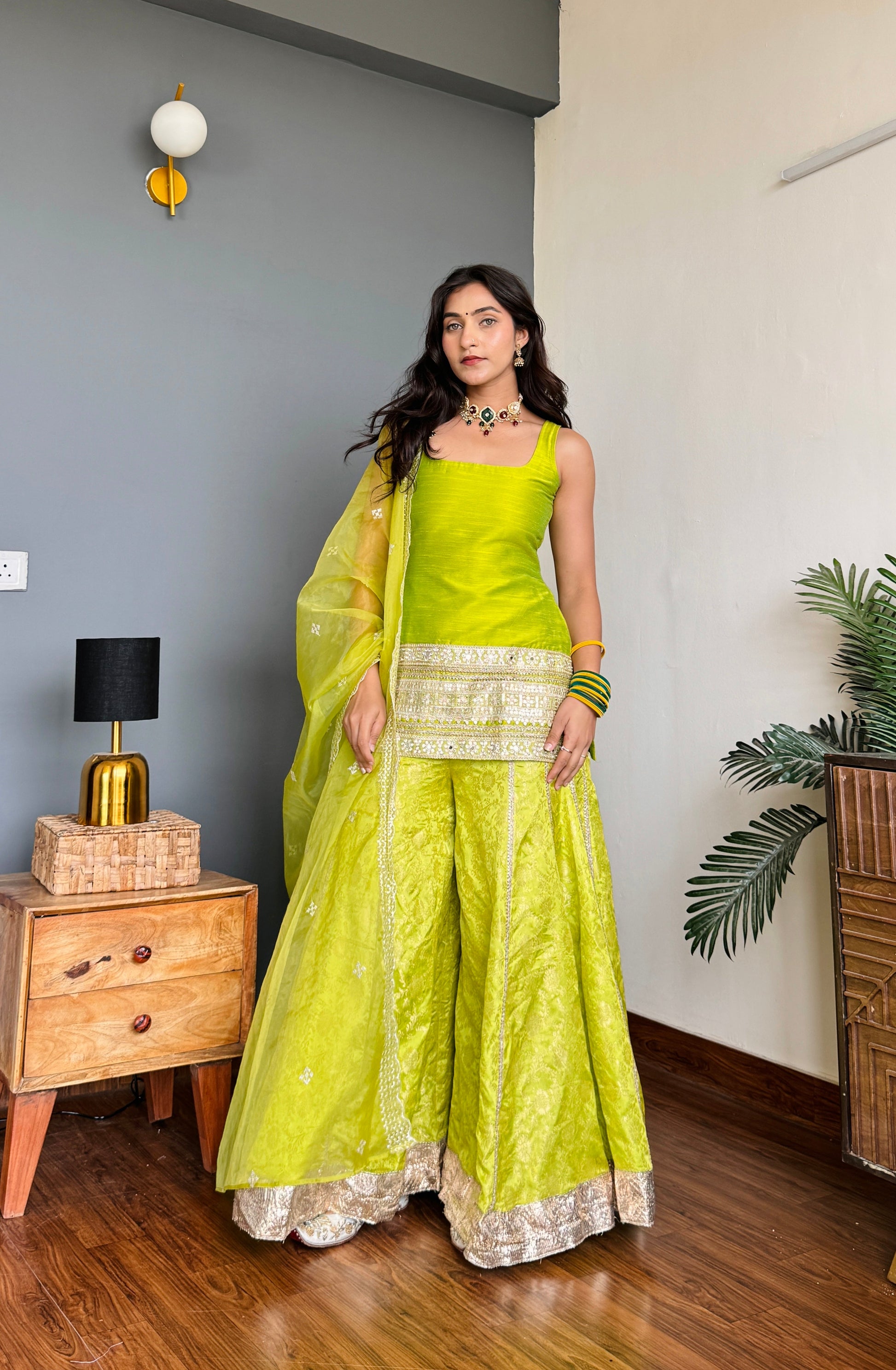 Tota Lime Green Kurta Sharara Set has a long kurta and wide sharara pants. It comes in a bright lime green shade. The fabric is light, so you can wear it for hours. Sharara pants flare out and move easily. Works for festivals, family functions, or casual weddings. Pair with flats or juttis. Keep jewellery simple.