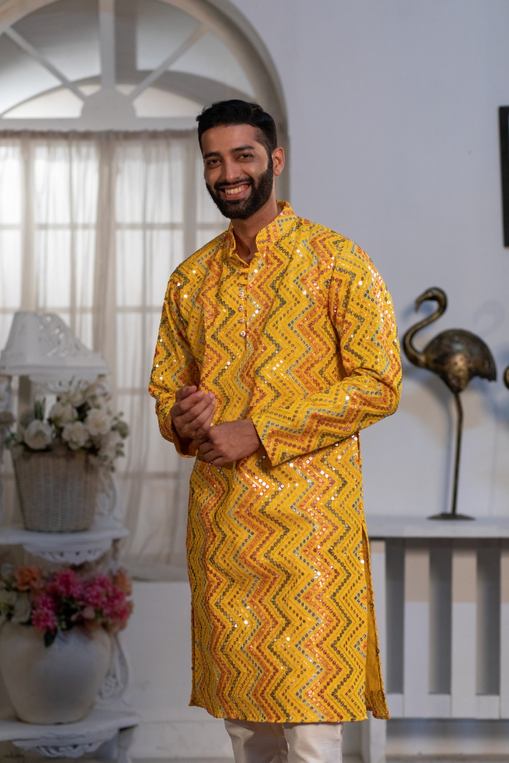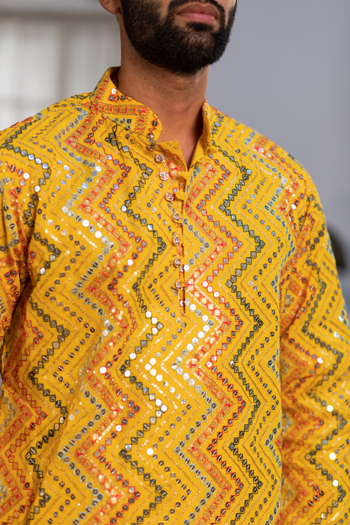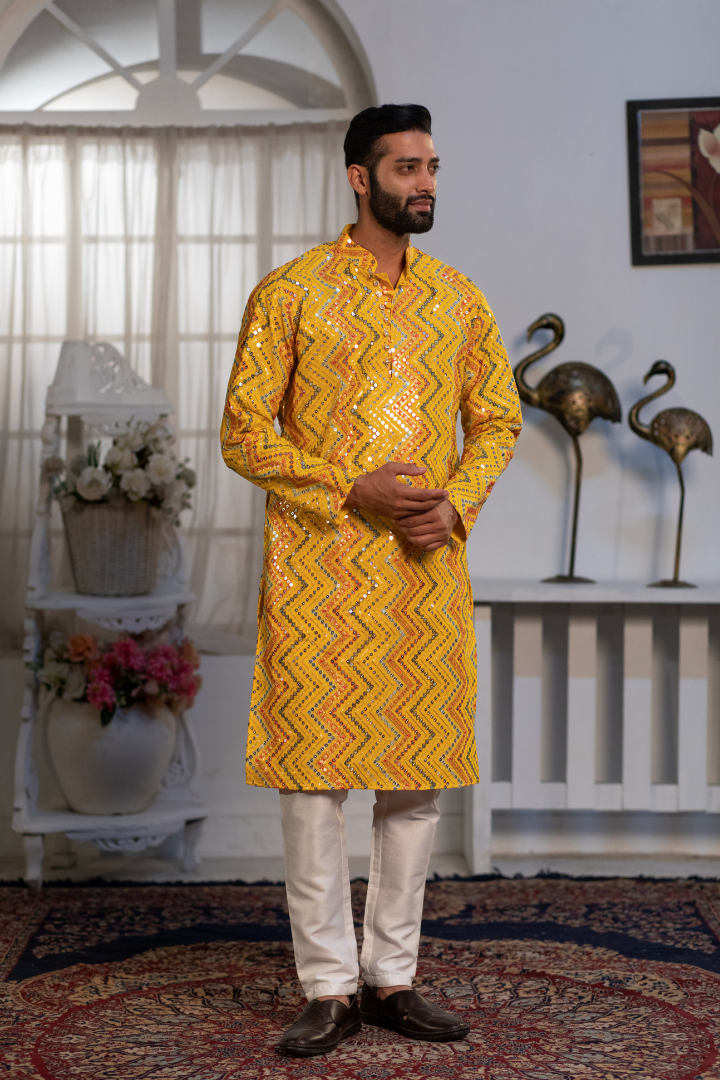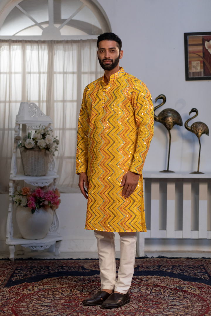 A radiant kurta in Tuscan sun shade with multi-colored sequin embroidery. The georgette base creates elegant movement.
