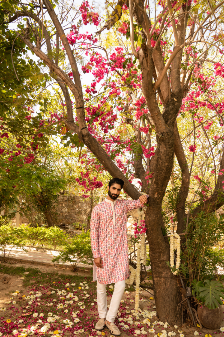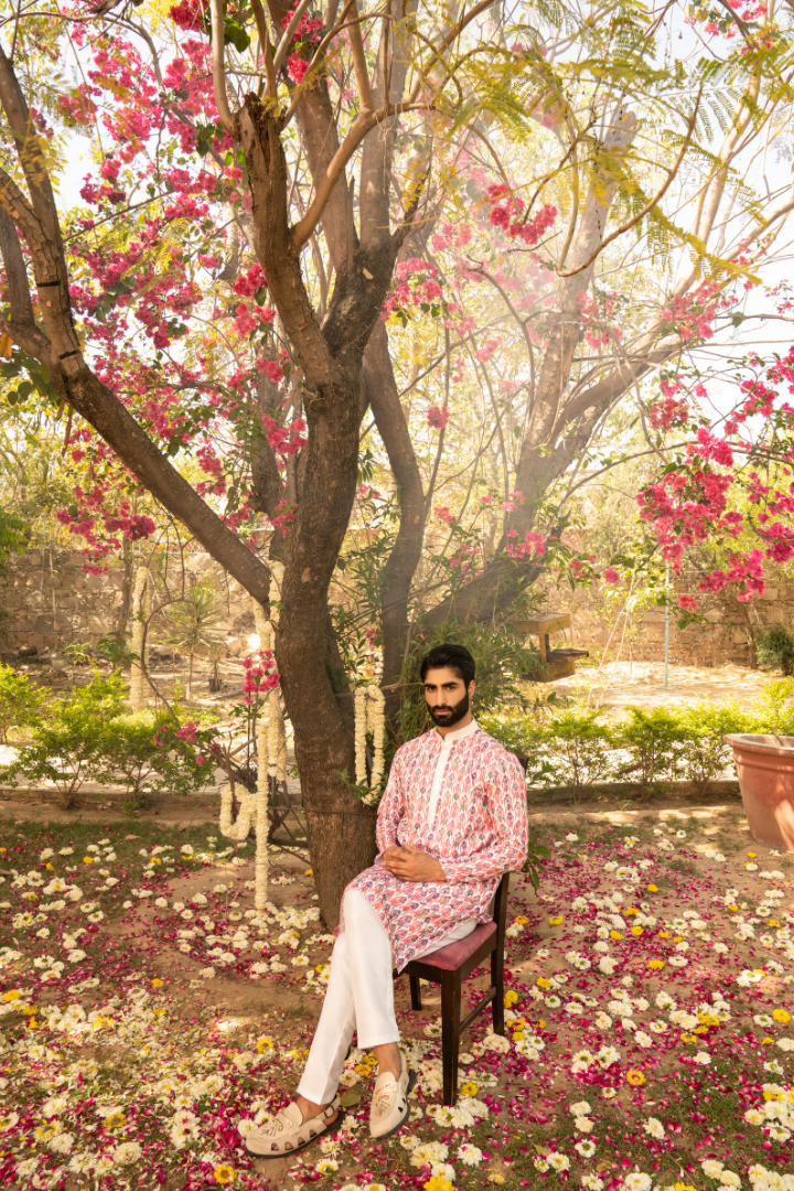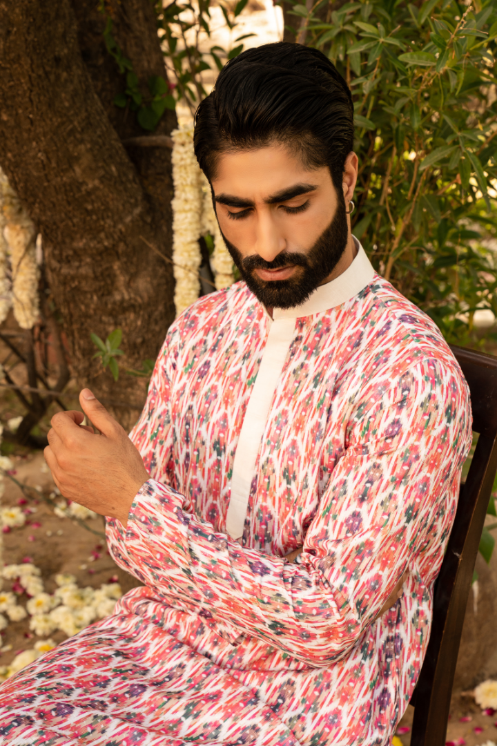 Make a statement with this coral pink kurta featuring stunning digital floral prints. The vibrant base color is beautifully complemented by intricate floral designs, creating a perfect blend of traditional and modern aesthetics.
