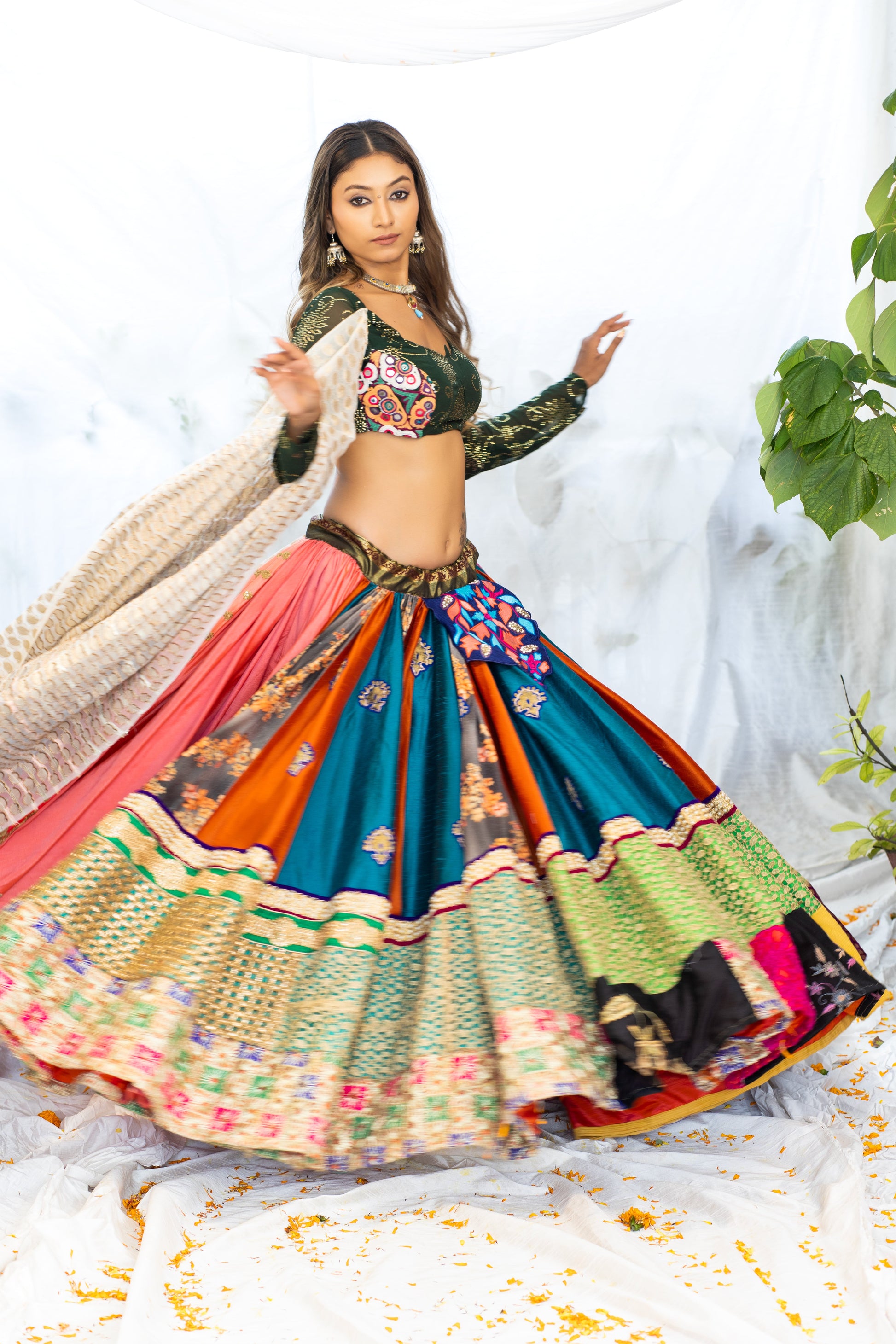 The intricate Kutchi embroidery adds a touch of traditional elegance, while the vibrant colors make a bold fashion statement. Each piece is lovingly handcrafted, ensuring impeccable quality and attention to detail. The flattering silhouette and comfortable fit make this lehenga set a must-have addition to your collection.