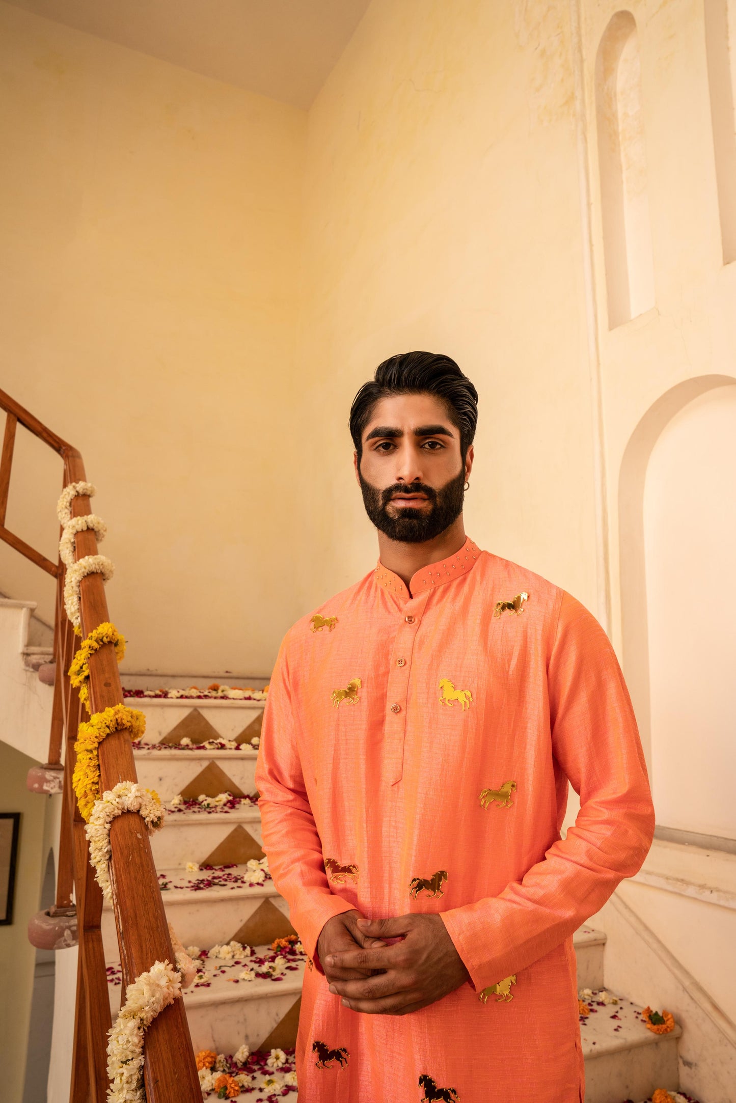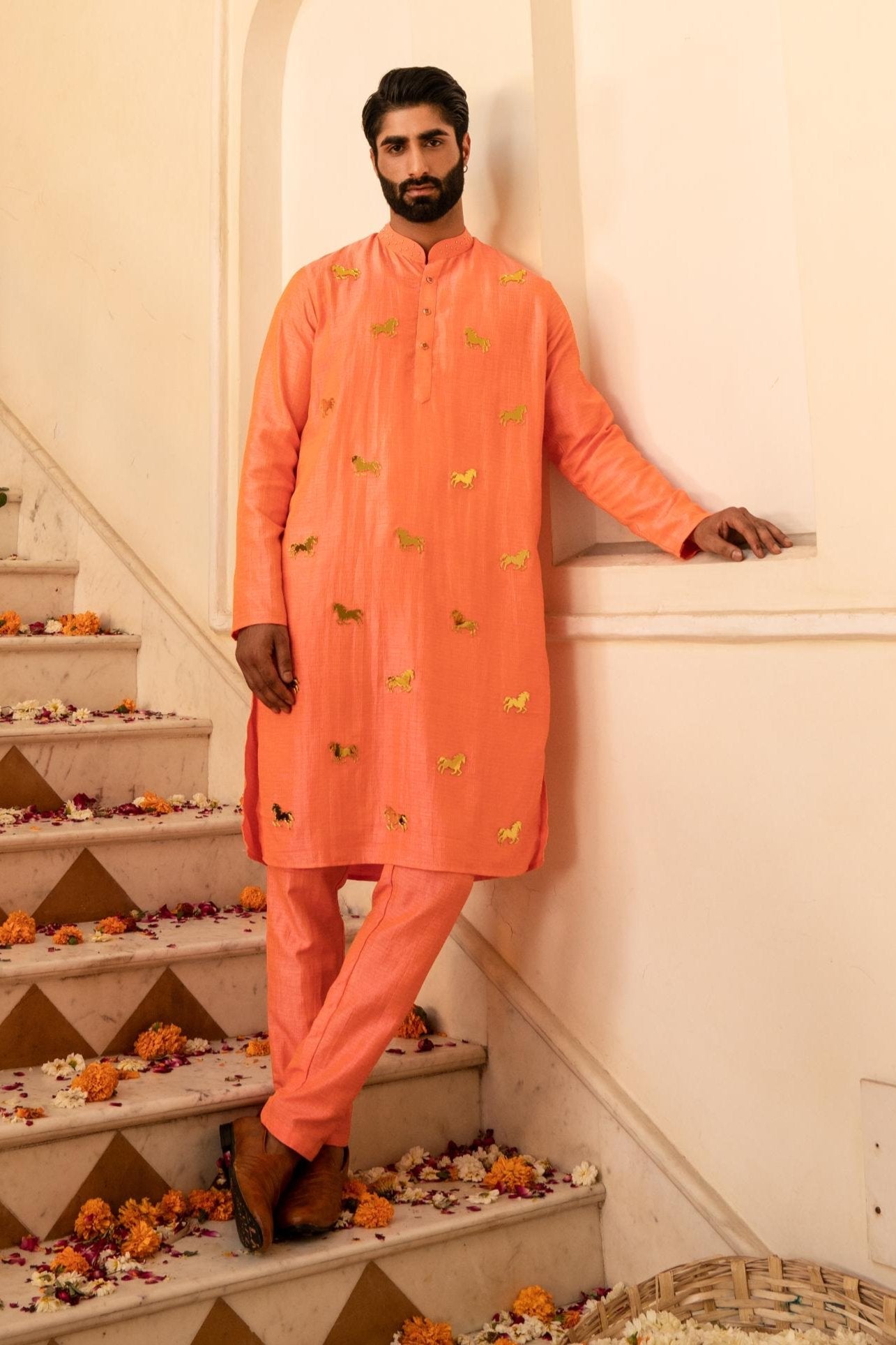 Vibrant Salmon Orange Crystal Mirror Kurta Set