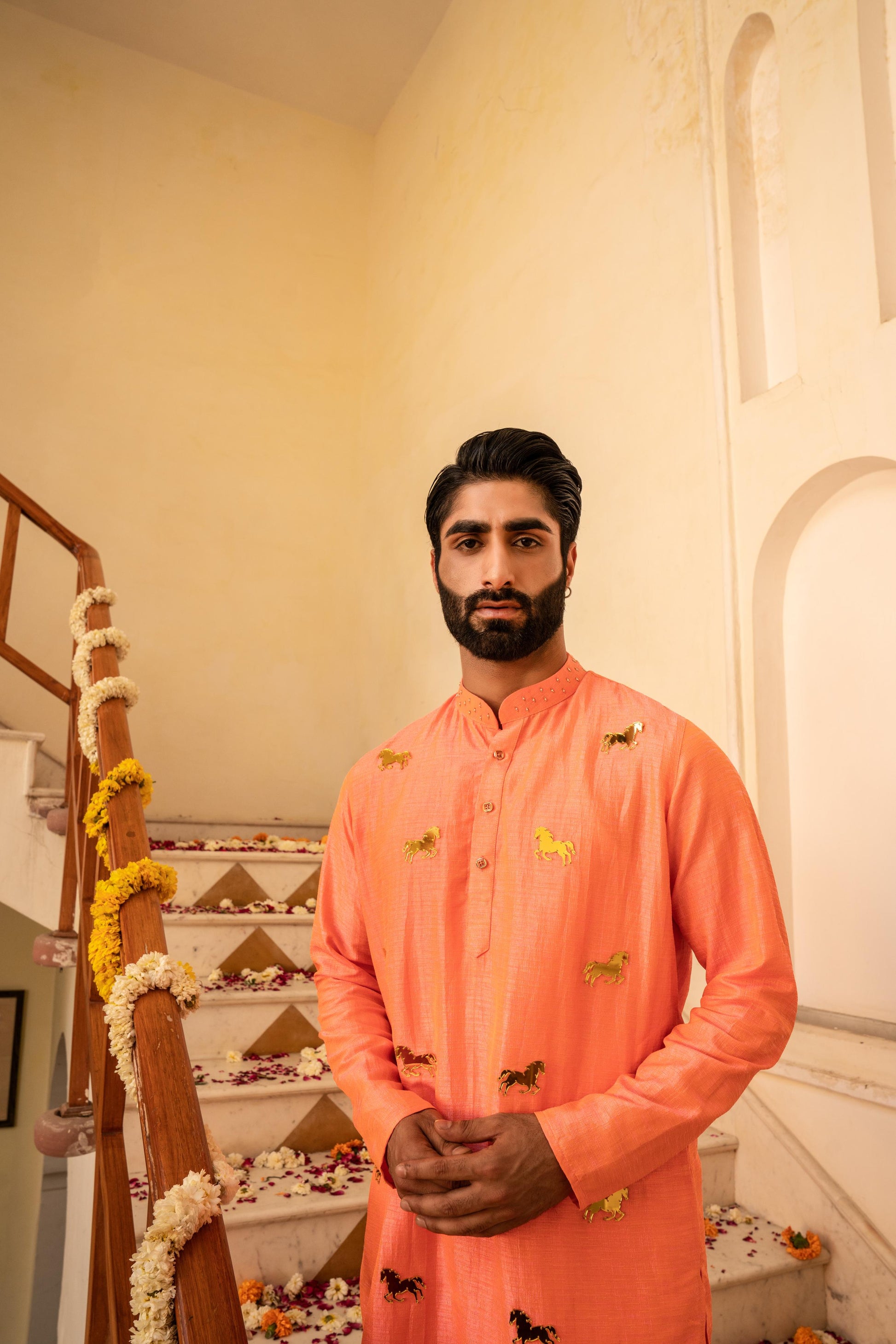 Stand out in this stunning salmon orange kurta set featuring exquisite crystal and mirror work. The vivid orange hue is beautifully complemented by the sparkling embellishments, creating a perfect balance of color and shine.