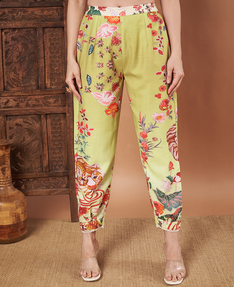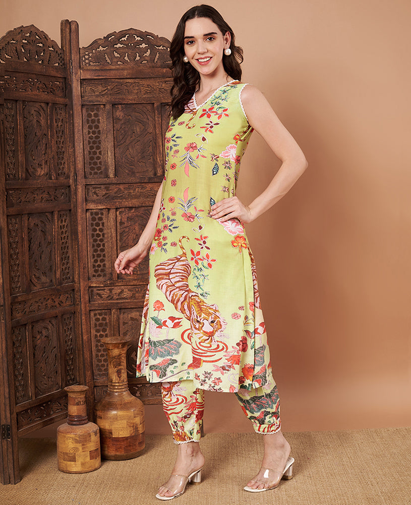 Victoria Tiger Print Cord Set is a matching top and bottom in yellow linen. The print has tiger motifs that stand out without being loud. The fabric is airy and lets air flow. The fit is relaxed, so you can move easily. Use it for casual outings, family hangouts, or simple events. Pair it with sandals or flats. Keep accessories minimal.