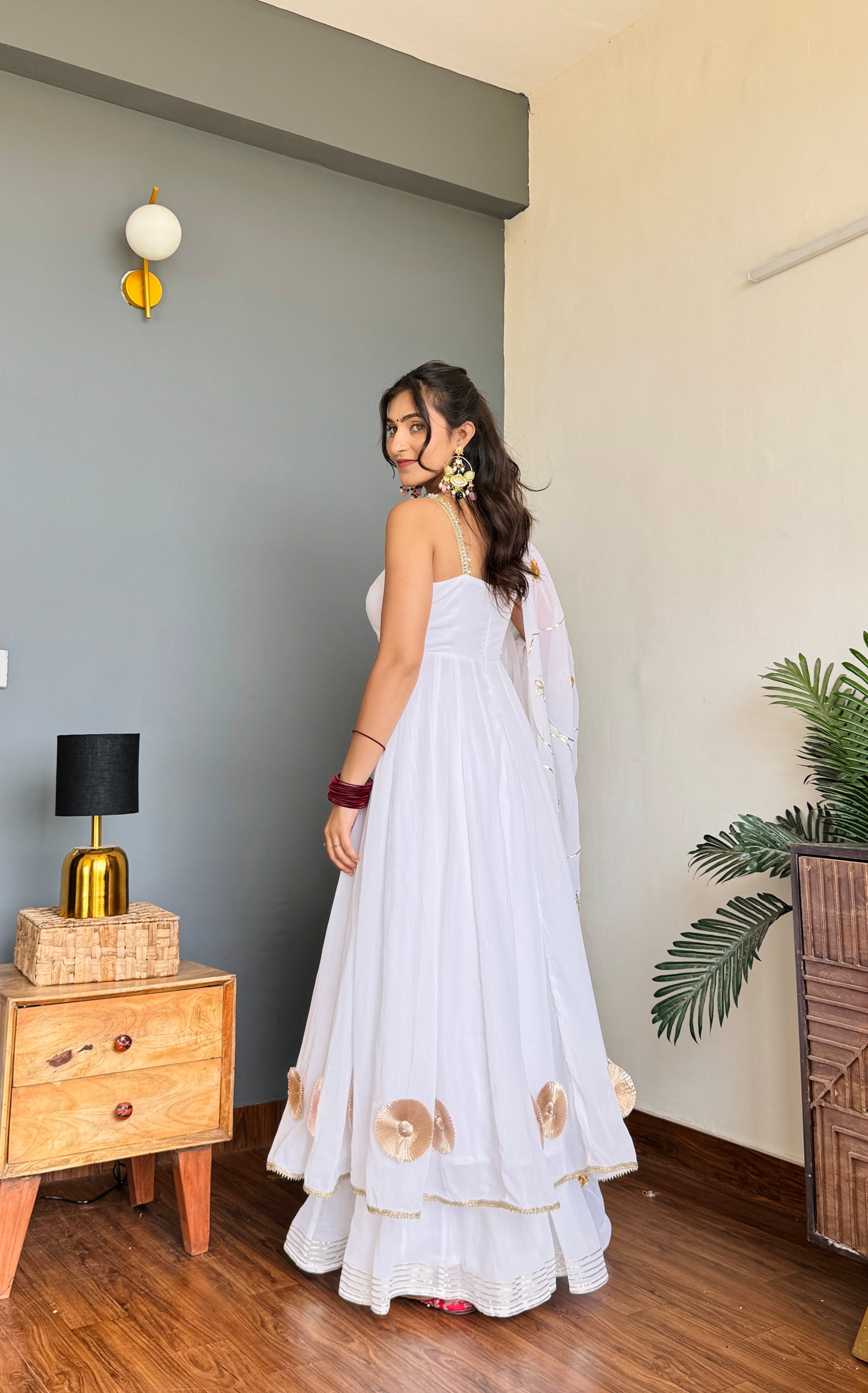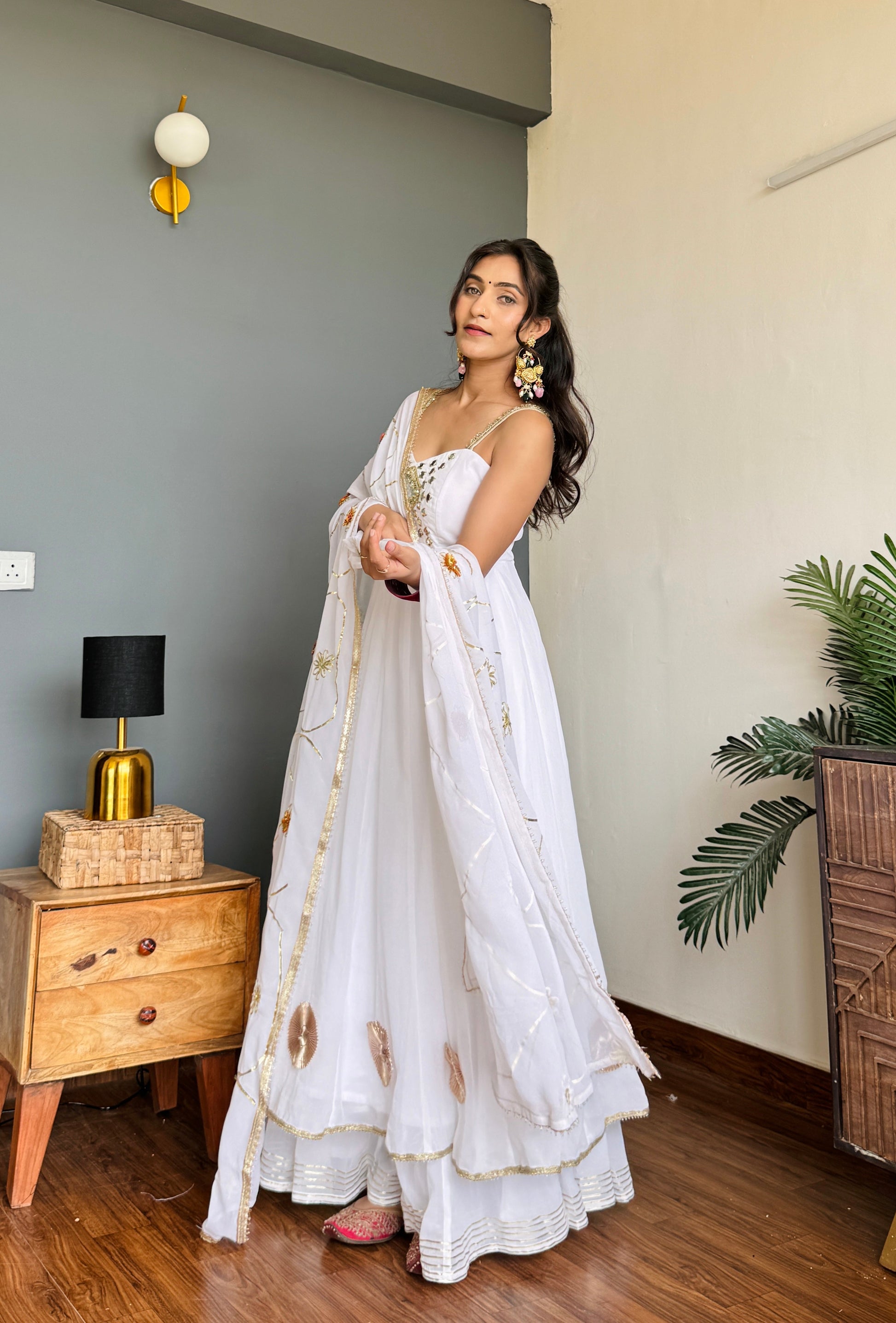White Gold Anarkali Gota is made of mal cotton blended with chanderi silk. It has gota work embroidery that shines softly under light. The flare gives it good movement when you walk. The white-gold shade keeps it calm but festive. The fabric is light and easy to wear for hours. Good for weddings, festivals, or family gatherings. Just add flats or simple sandals. Light earrings complete the look.