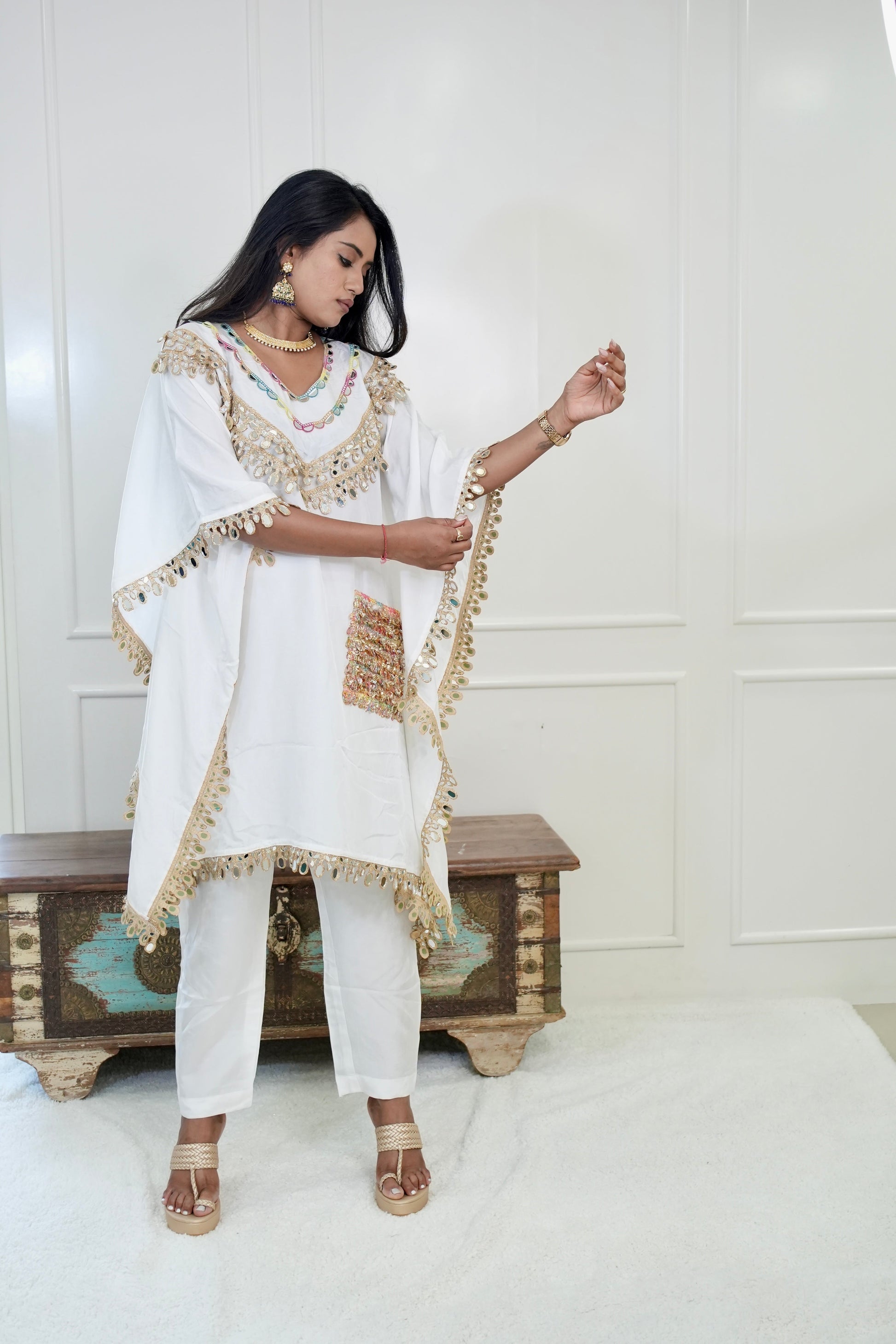 White Raw Silk Kafta Kurta With Pants is made from raw silk blended with cotton. The kafta-style kurta is loose and airy. The pants are cut straight and sit relaxed for easy movement. The fabric feels soft and stays cool, even if you wear it for many hours.Works well for family time, festivals, or relaxed gatherings. Pair it with simple sandals. Just light earrings finish the look.