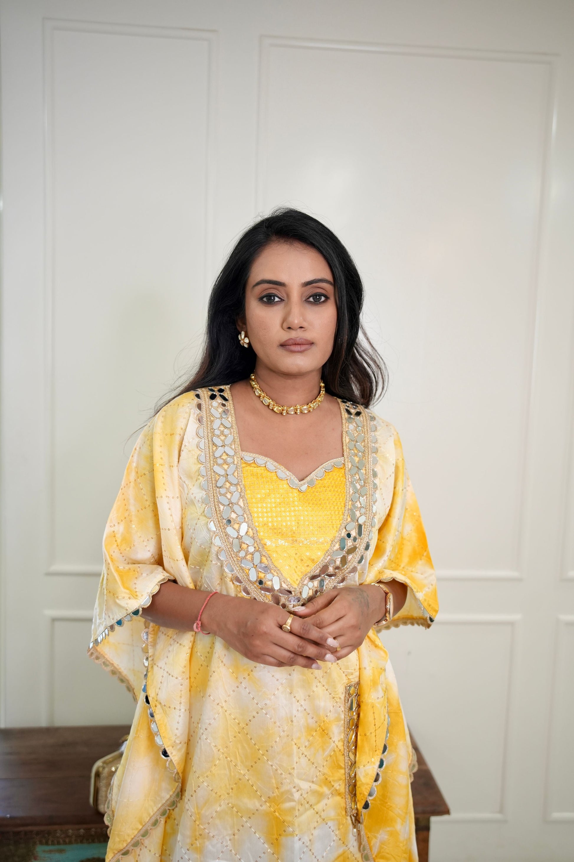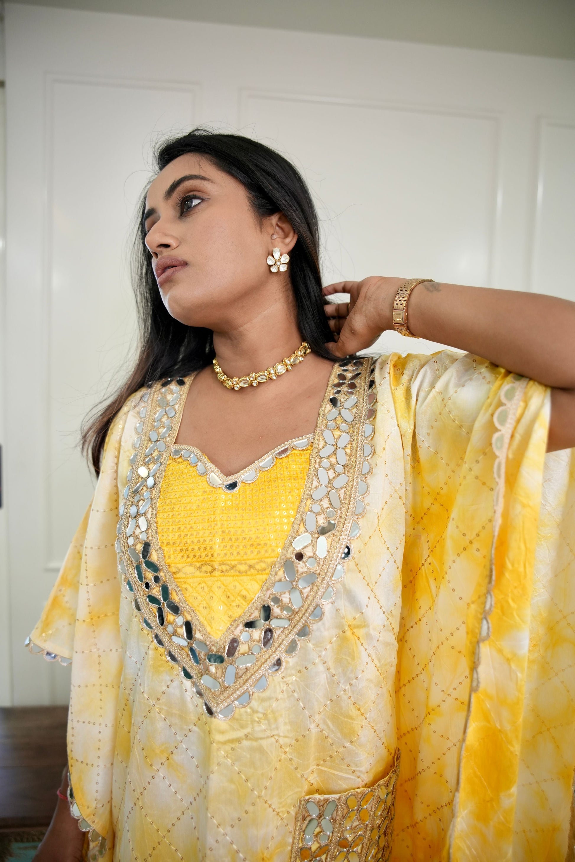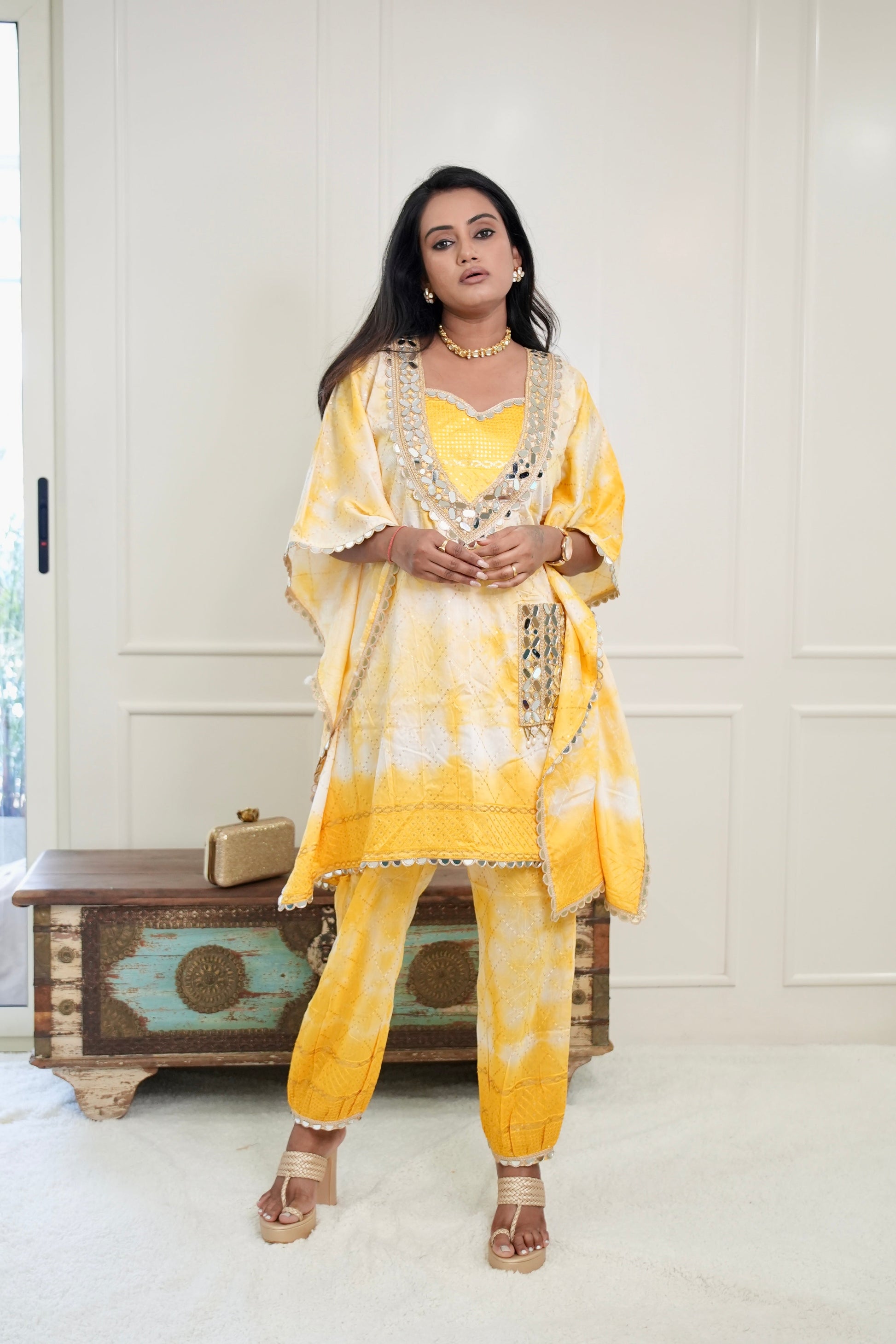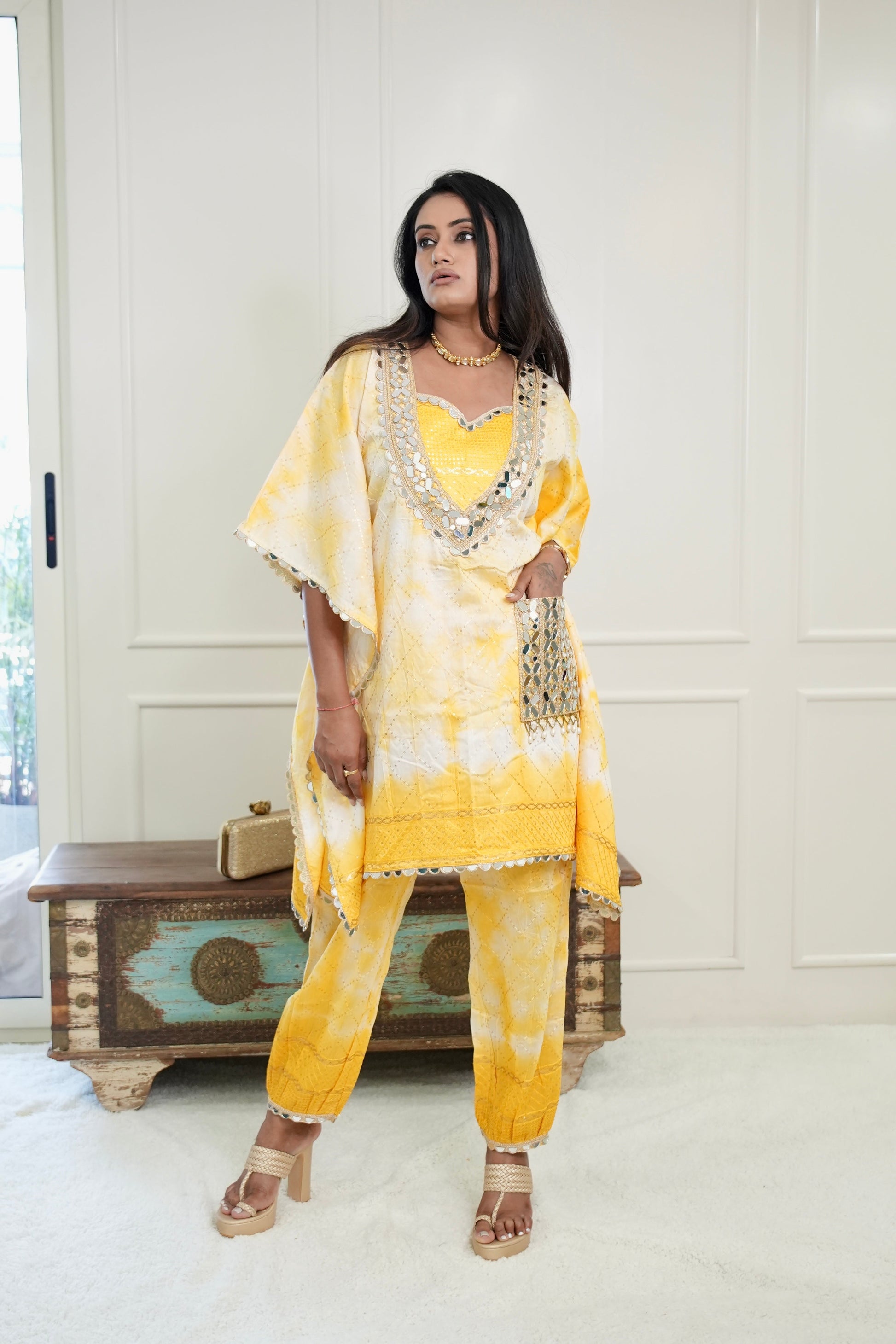 The Yellow Batik Kaftan Kurta Set comes with a kaftan top and matching pants. The light fabric with batik print feels soft on the skin. The loose fit makes it comfortable and gives free movement. You can wear it for hours without any trouble. This set is good for family events, festive days, or casual meets. Wear it with sandals or flats. Small earrings are all you need.