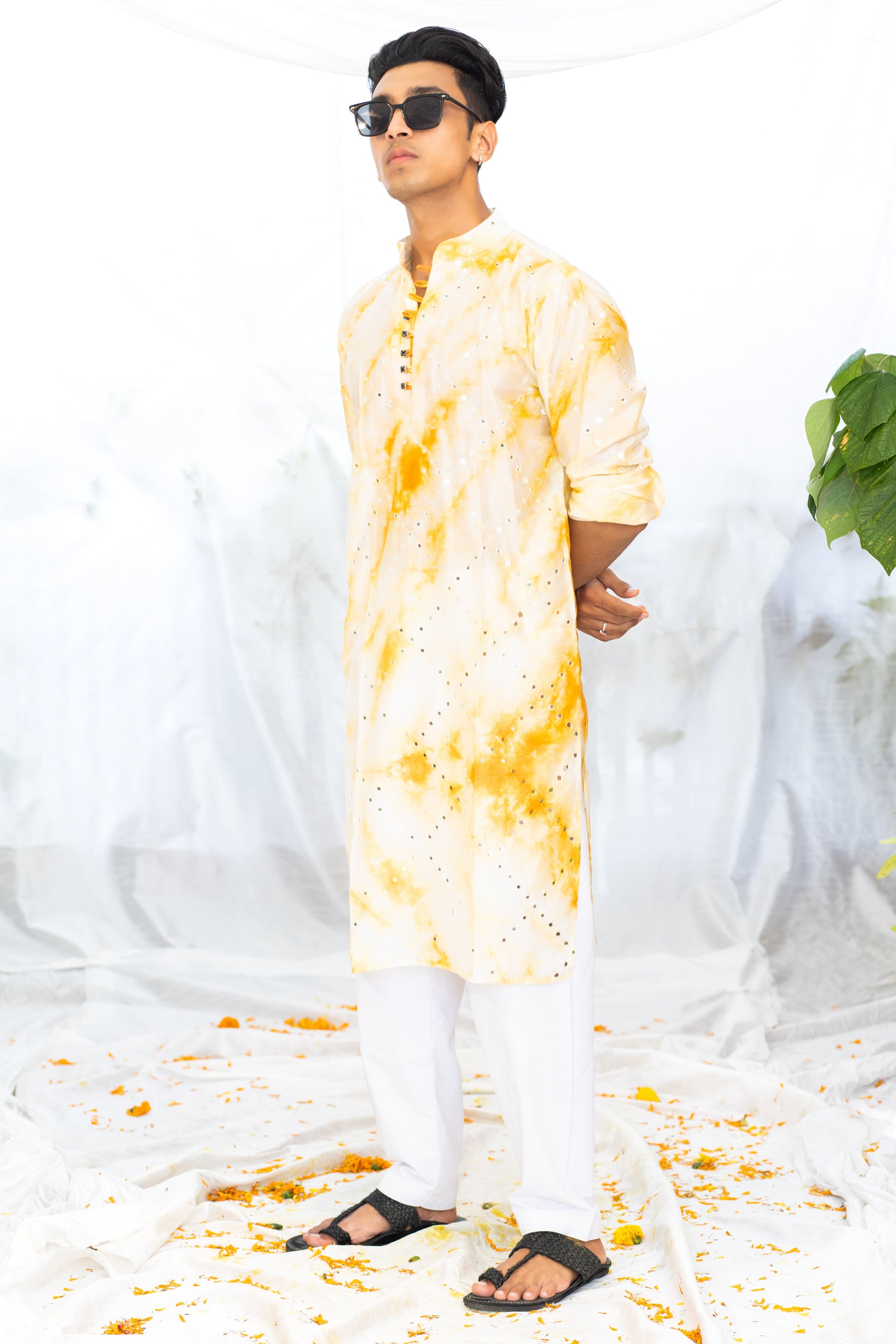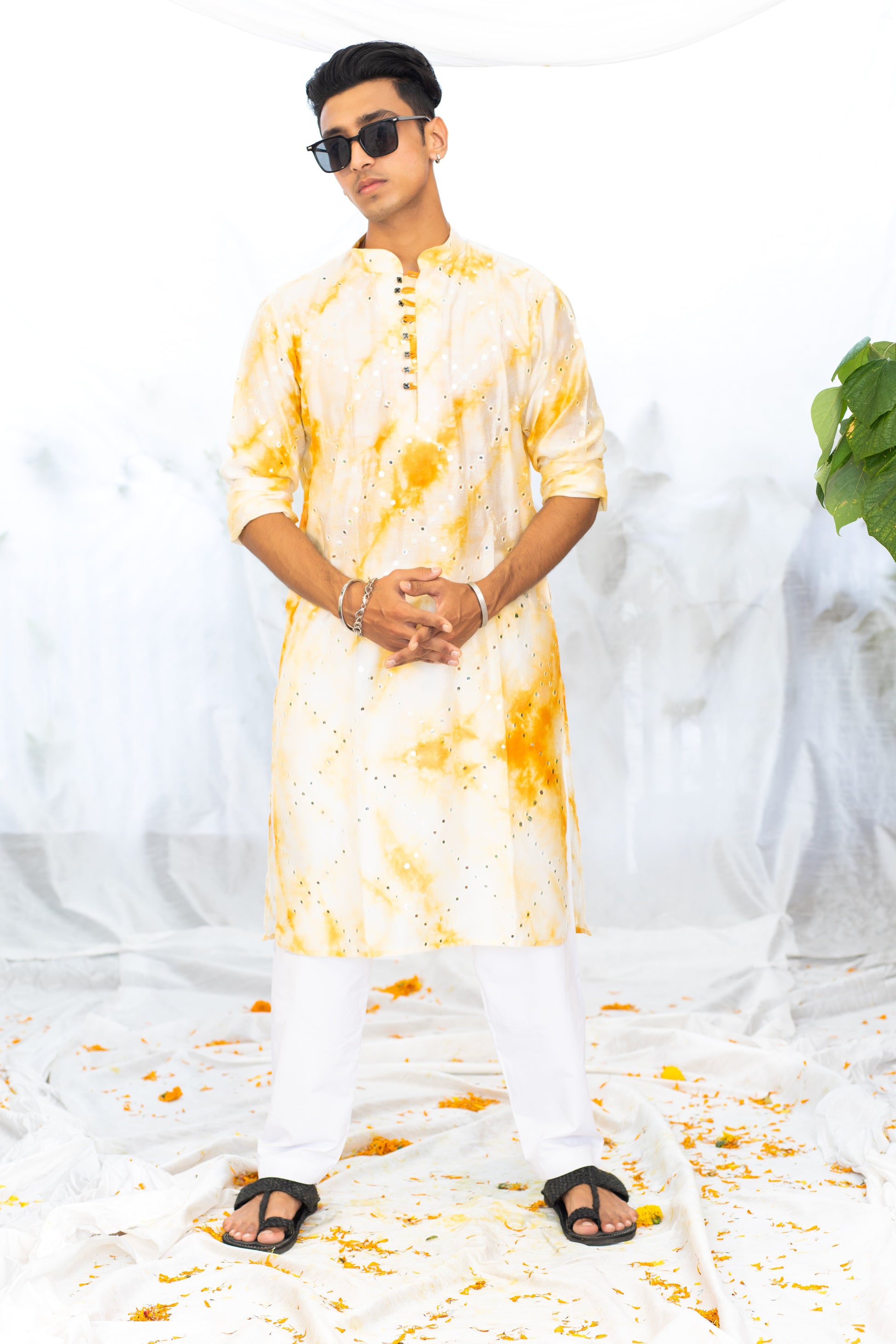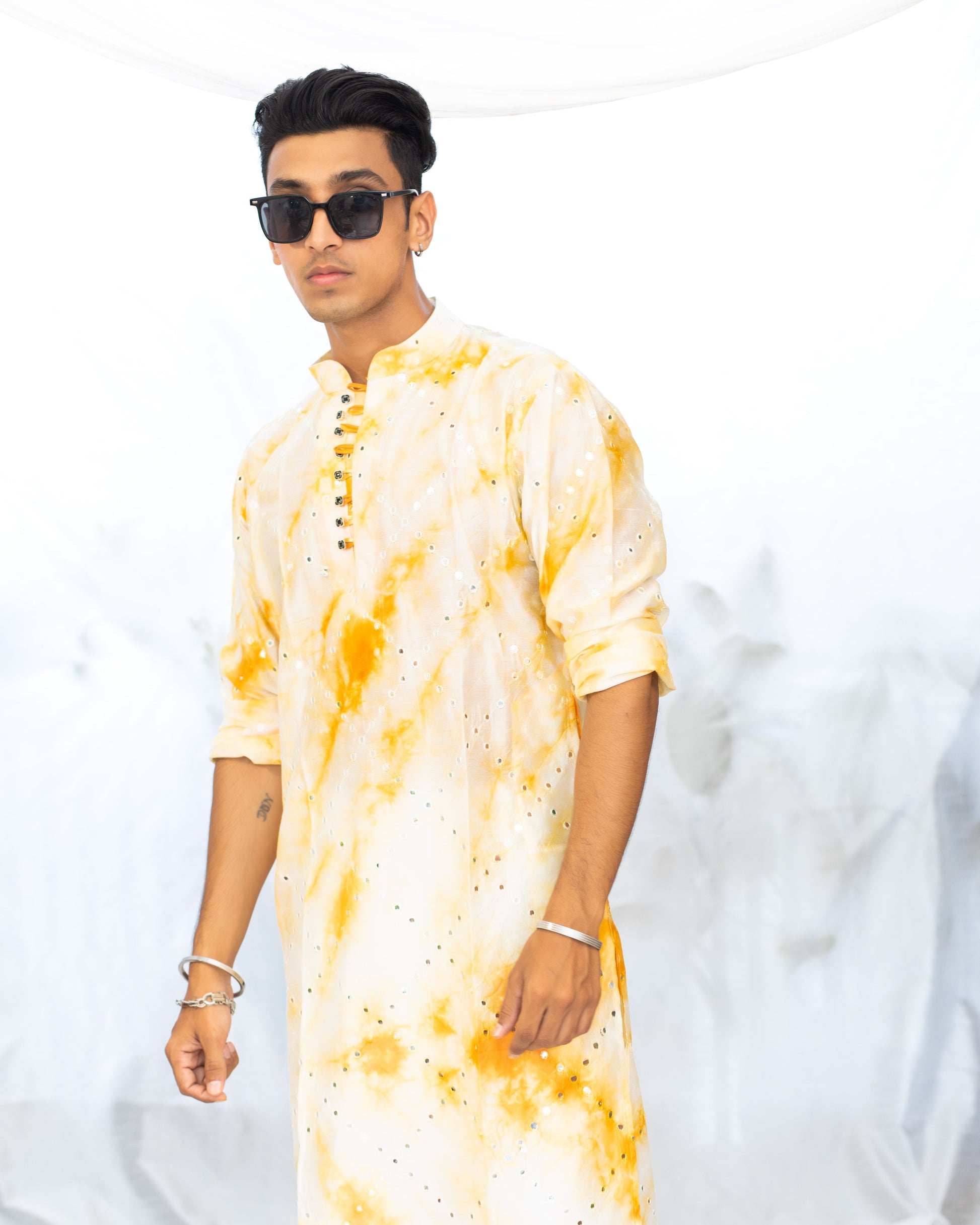 Crafted from premium quality fabric, this haldi ceremony mens kurta ensures both style and comfort. The tie & dye detailing lends an artistic touch, making each piece unique. Whether you're dressing up for a festive occasion or a casual gathering, this kurta effortlessly stands out. Embrace the beauty of tradition with a modern twist – order yours today and make a fashionable statement wherever you go.