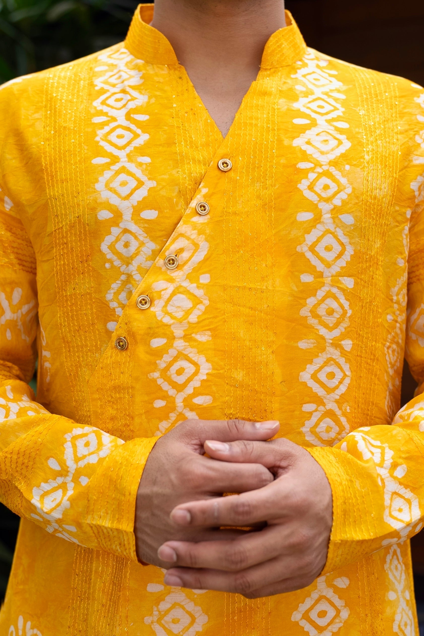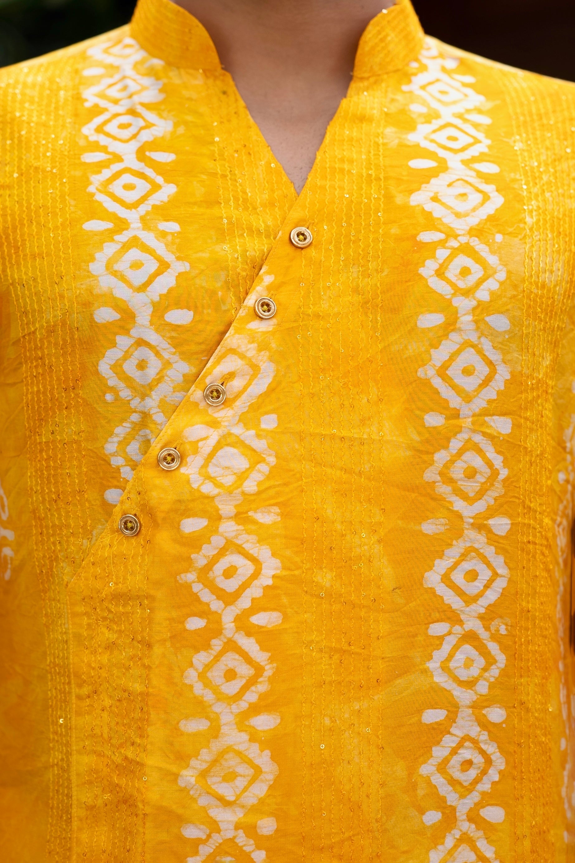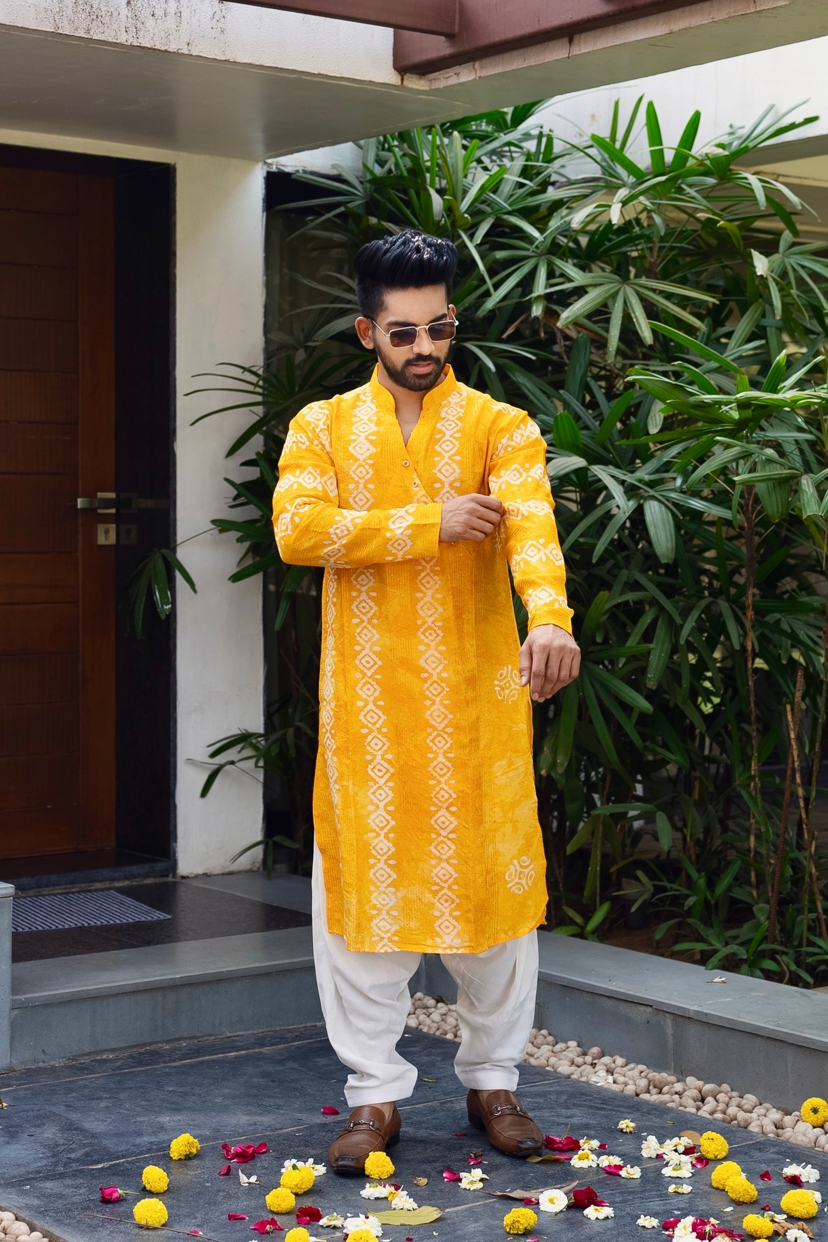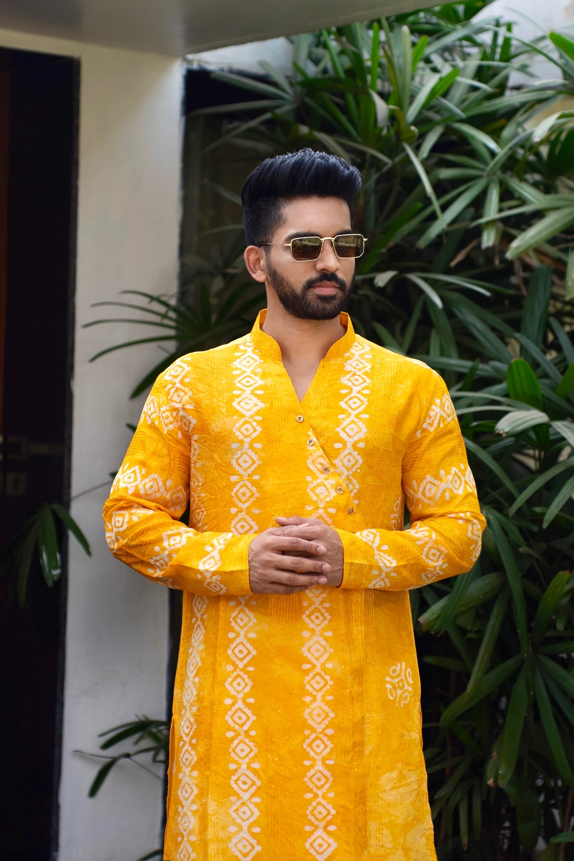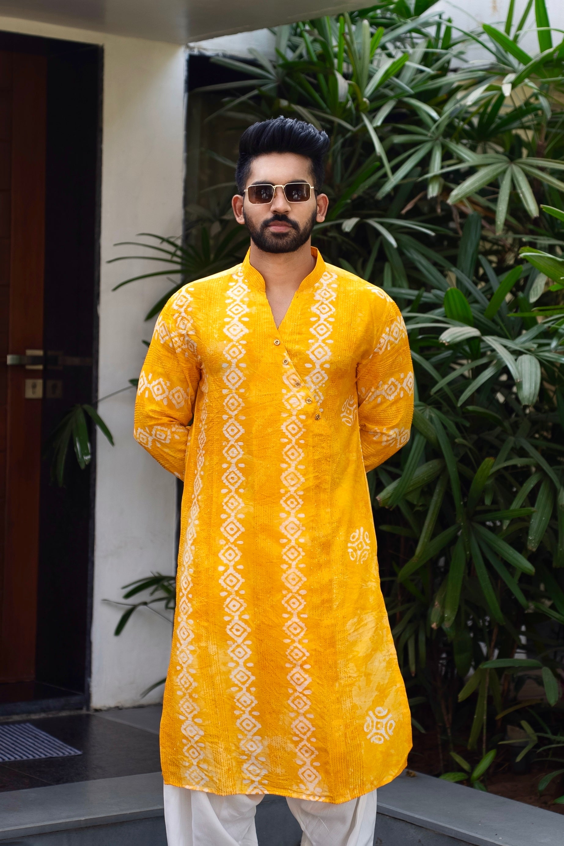 Yellow Optimism White Batik Kurta has a white base with yellow batik patterns. The fabric is light and soft. The fit is relaxed, giving room to move. The yellow design gives it a bright look. Suitable for festivals, family functions, or casual days. Match with churidar or straight pants. Small accessories are enough to complete the look.