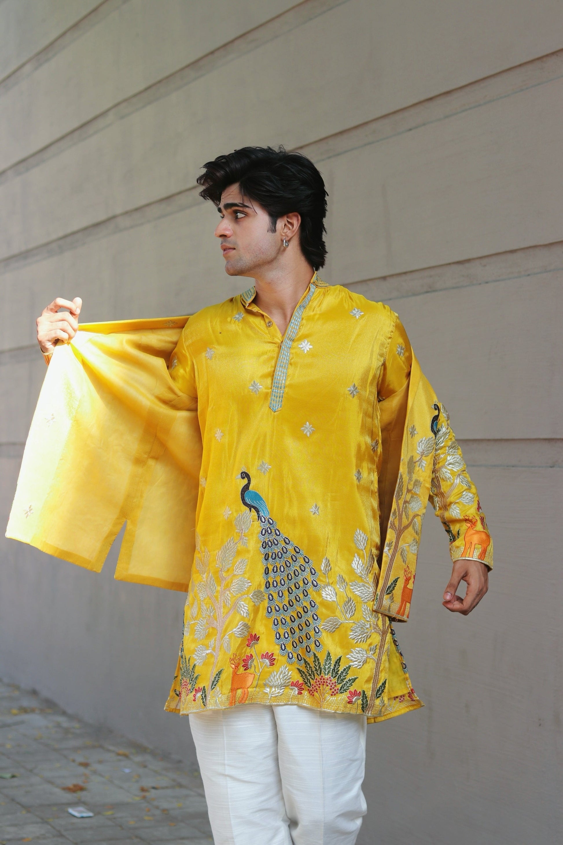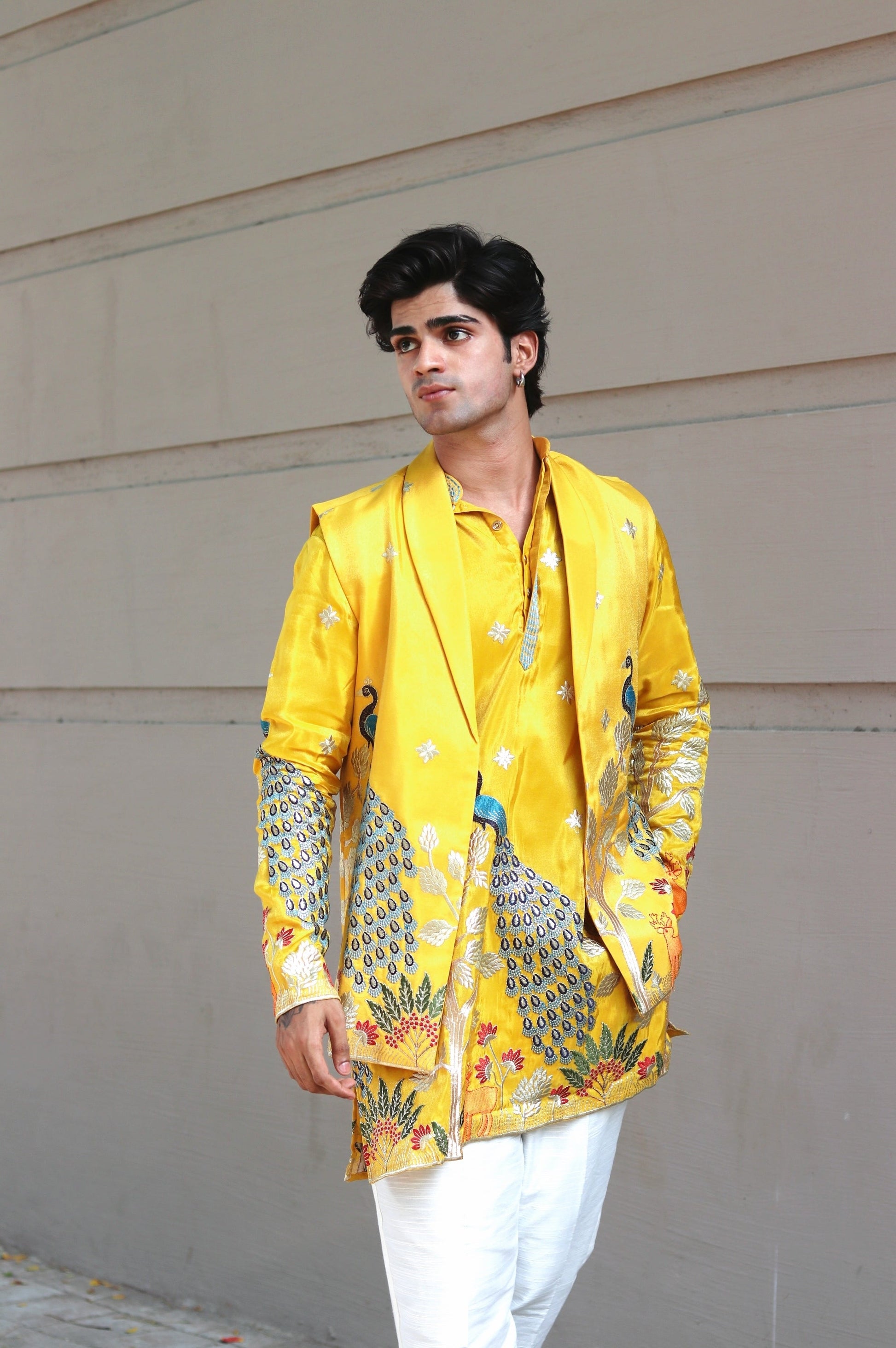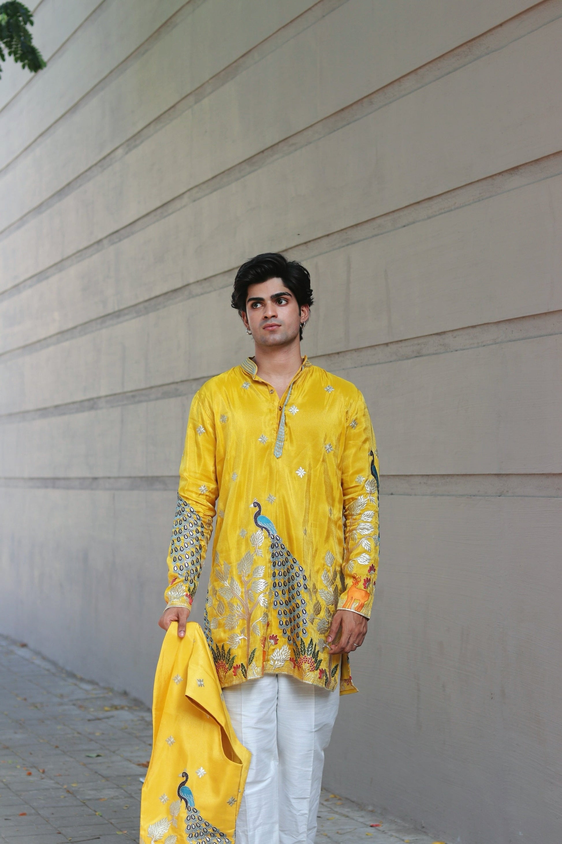 Yellow Rangeela Mor Kurta with Koti is made of light material that feels soft. The kurta has peacock (mor) embroidery and comes with a matching koti. The fit is loose so you can move freely. The fabric breathes well, so wearing it for hours is okay. Works for weddings, festivals, or family meets.