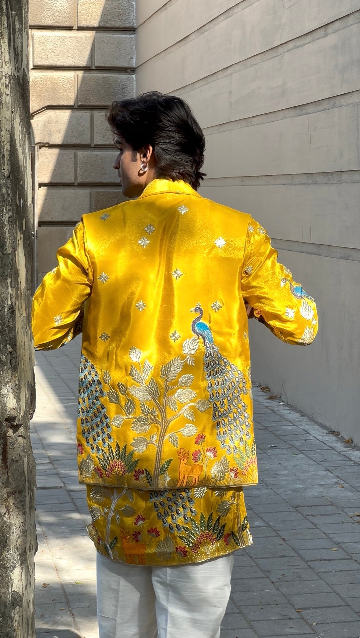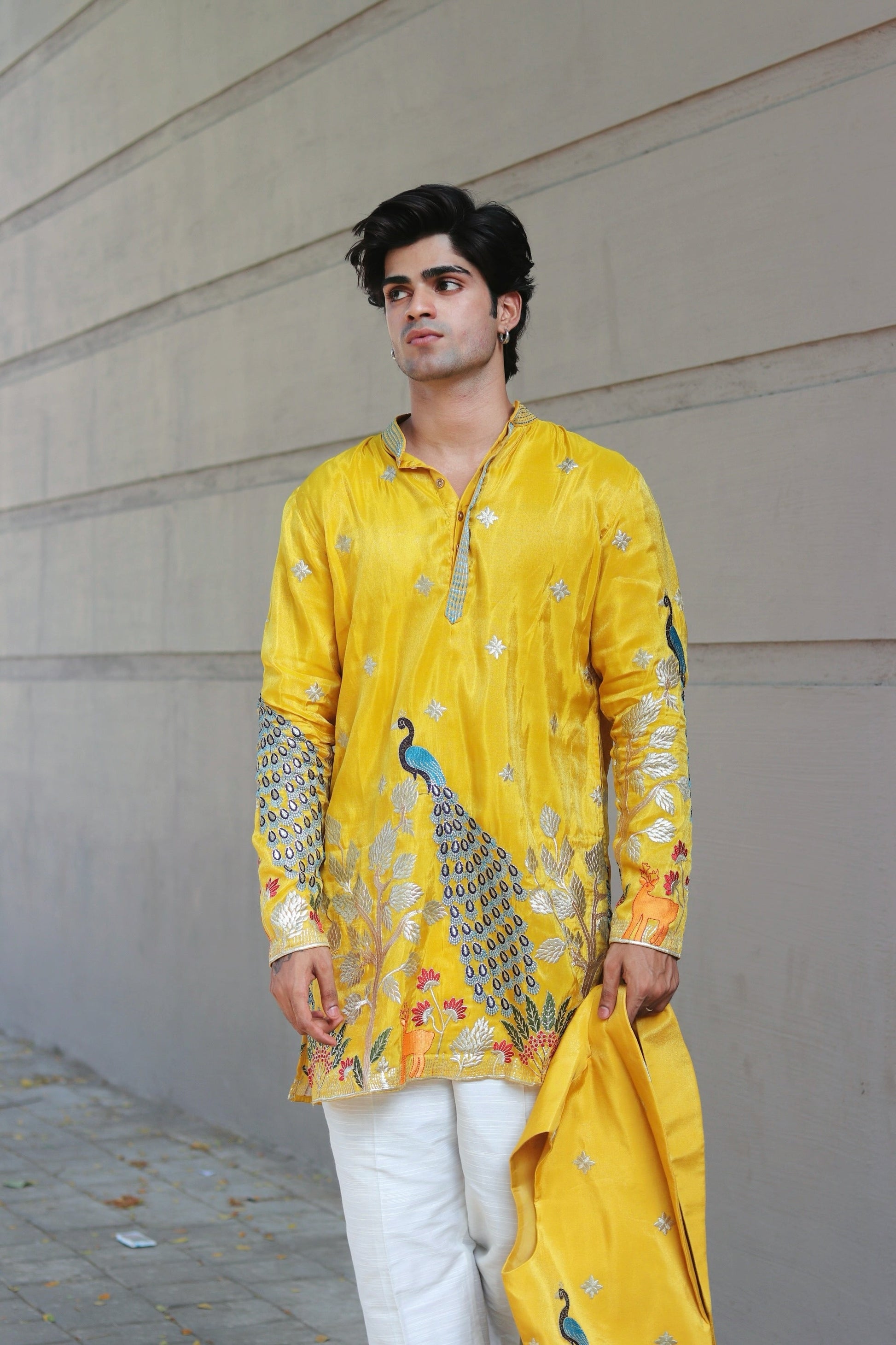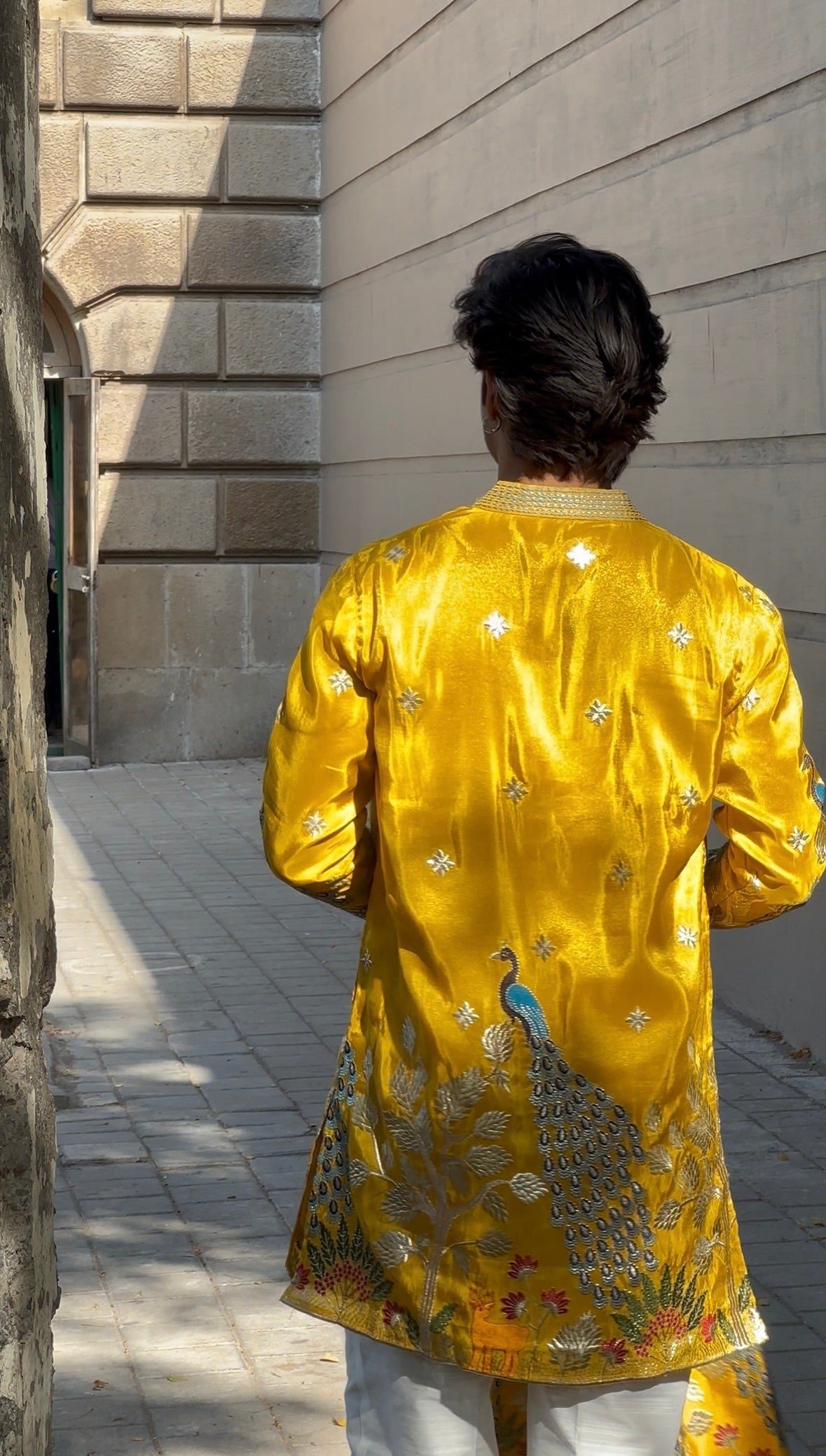 Yellow Rangeela Mor Kurta with Koti is made of light material that feels soft. The kurta has peacock (mor) embroidery and comes with a matching koti. The fit is loose so you can move freely. The fabric breathes well, so wearing it for hours is okay. Works for weddings, festivals, or family meets.